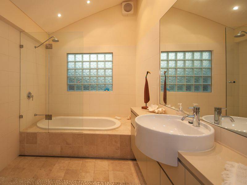 The kitchen is part of the open plan lounge dining room which has wide bi-fold doors opening out to a large entertaining deck. The deck wraps around the home to the outdoor private sunken spa on a raised deck.