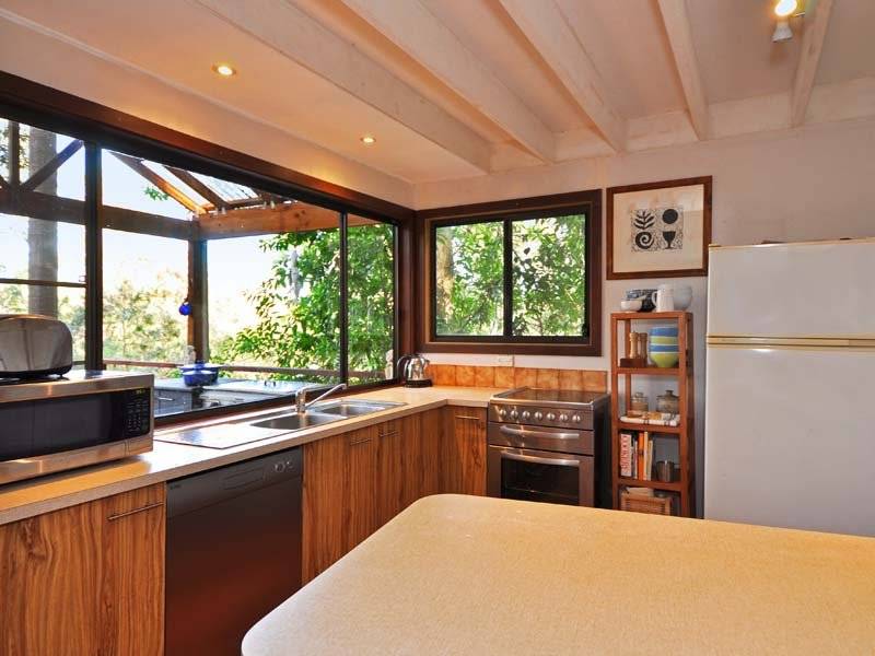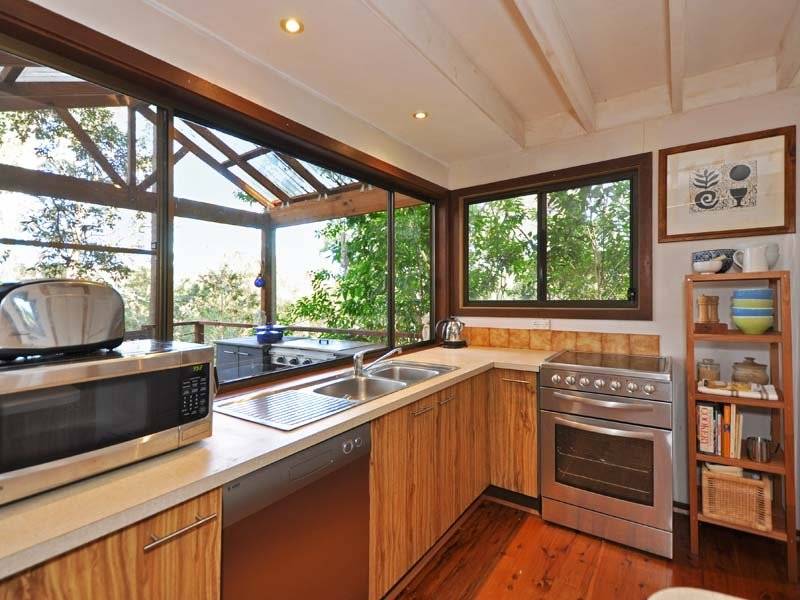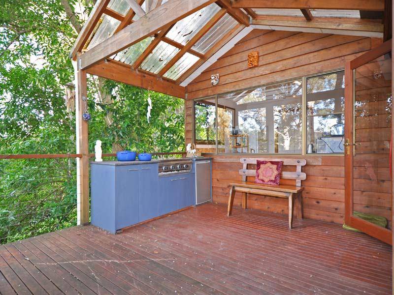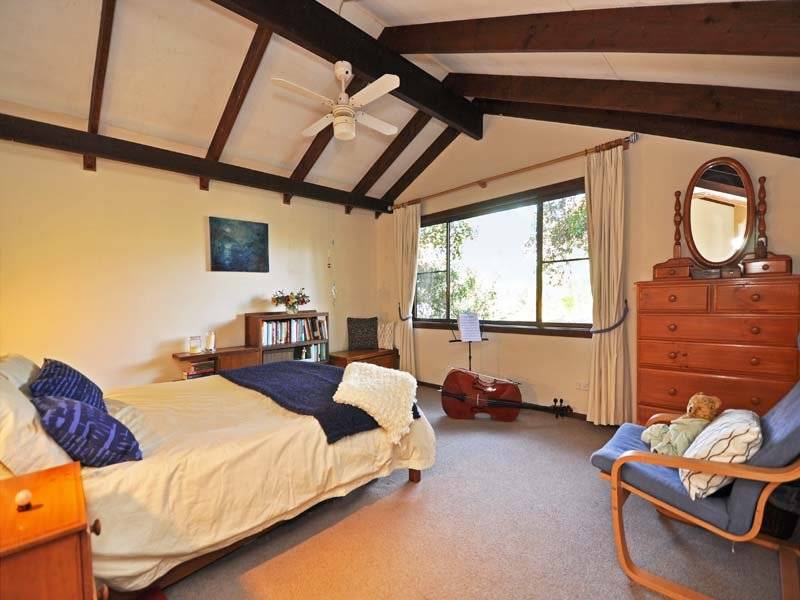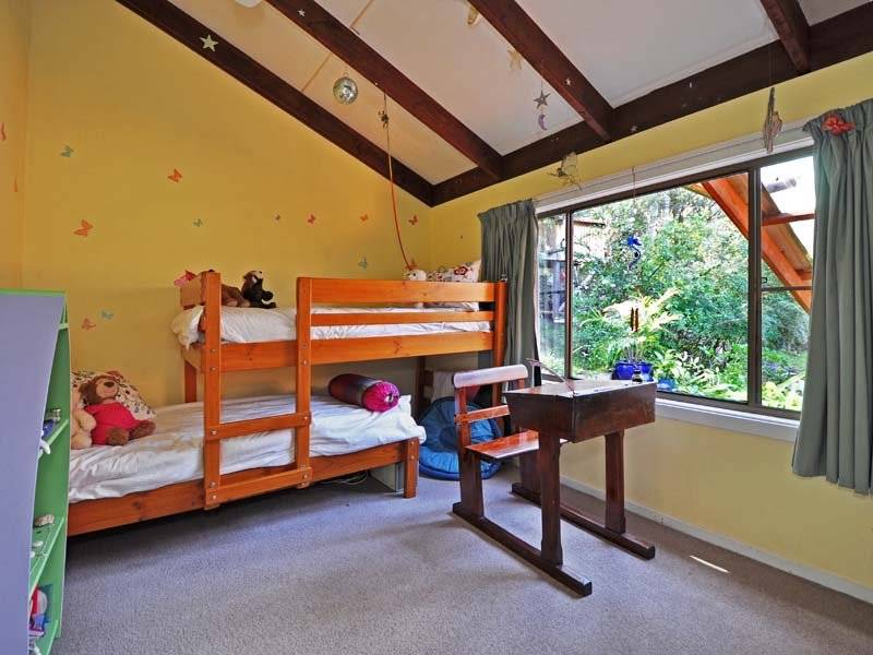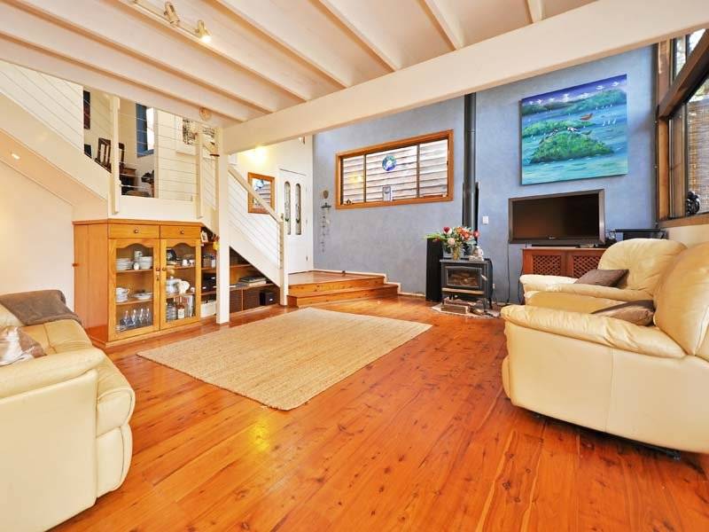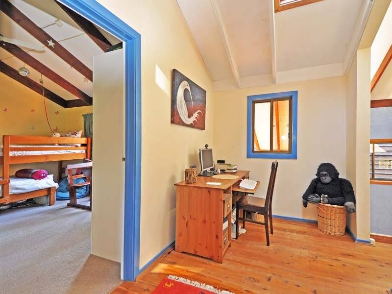 The lower level is open plan with high cathedral ceilings, polished timber floors, a slow combustion fire and reverse cycle air conditioning. The kitchen has wide windows with a leafy outlook, dishwasher and an adjacent pantry/utility room.