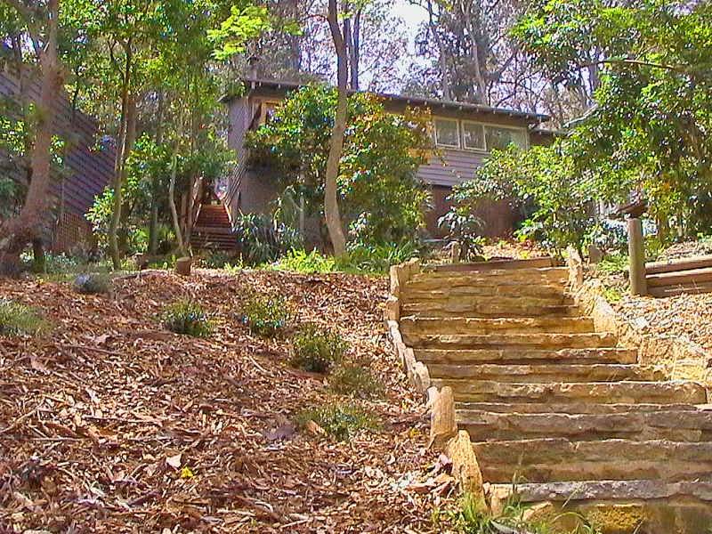 The grounds feature an impressive set of sandstone and timber steps linking with timber decks which lead you to the home.