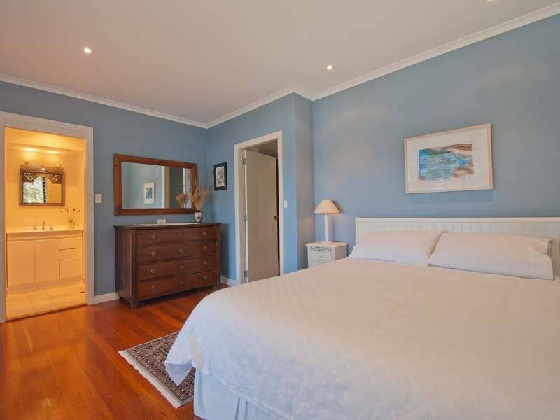 White timber flooring and wrap-around picture windows with panoramic views of the bay create an enviable ambiance. The open-plan lounge/dining area is warmed by a Jetmaster open fireplace in winter and the large eat-in kitchen has heated floors and an adjoining walk-in pantry.