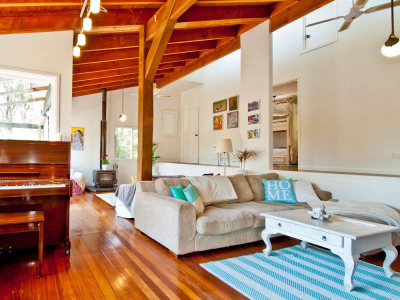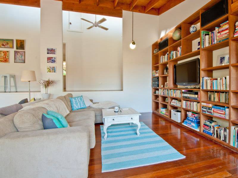 The combined lounge dining room features solid timber posts, a combustion fire and floor to ceiling timber shelving. The polished timber floors are featured throughout the home.