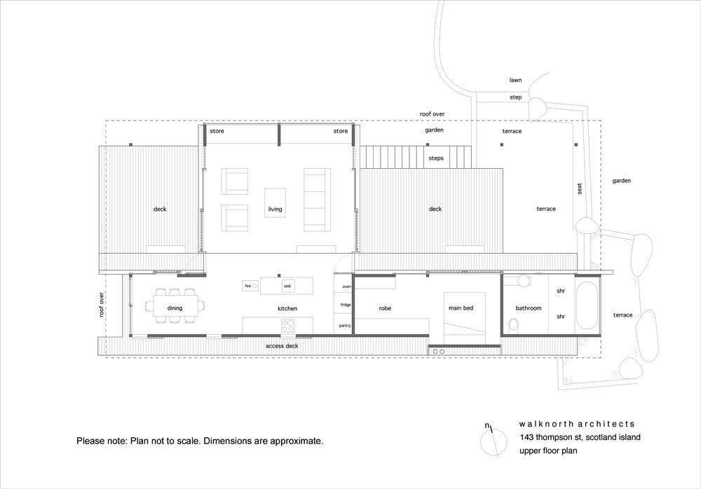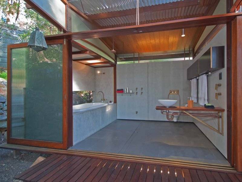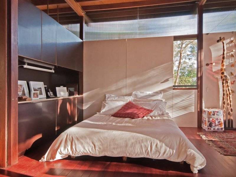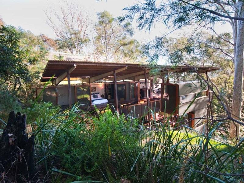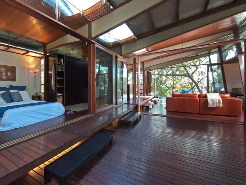 Adjoining the upper deck is the spacious main bedroom with a walk in robe and the main and a streamline bathroom with double shower and bath with both rooms completely opening out to the beauty and seclusion of the bush.