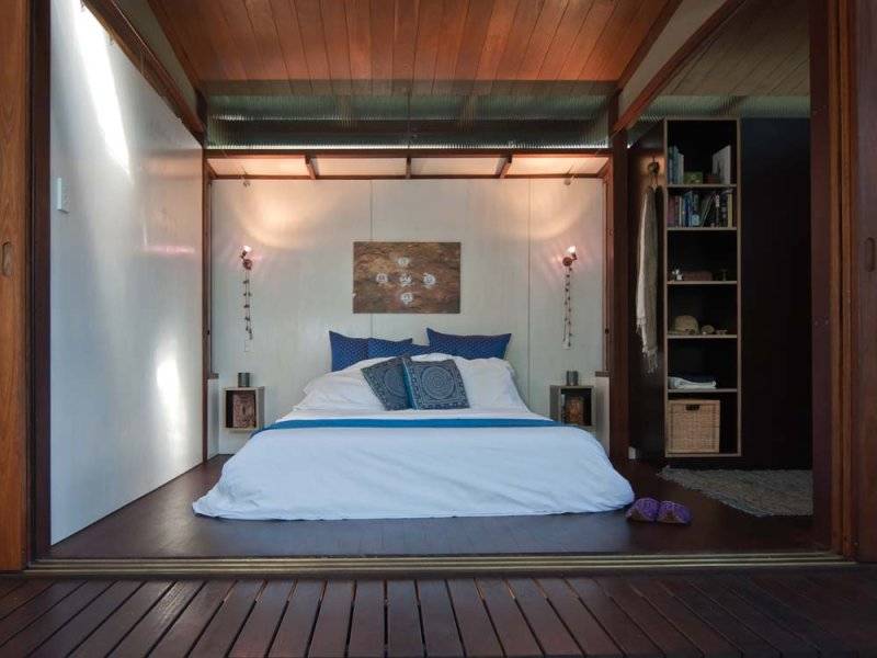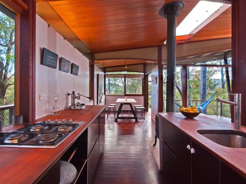 The open plan upper level with high and angled ceilings completely opens via wide sliding glass and timber doors creating an extension of space from the living room to a huge entertaining deck and a sandstone terrace. The galley style kitchen and dining room are also located here along with a wood burning stove and a covered deck which is a great place to relax in a hammock to enjoy the view.