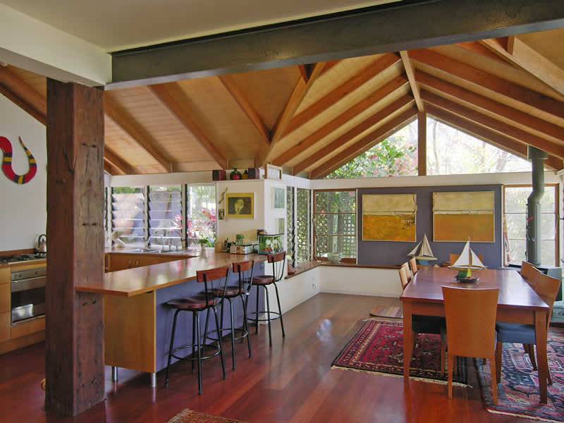 A large open plan timber kitchen and dining area with high pitched ceilings and timber floors are complimented by substantial recycled timbers used for kitchen benchtops and central posts.