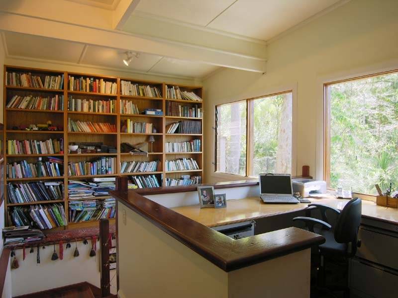 The second level consists of a spacious office area with floor to ceiling bookshelves, three large bedrooms, laundry and second bathroom. The main bedroom, which has a walk in robe, and second bedroom share wide opening louvered and bi-fold windows capturing the water views, these rooms being able to be joined by opening a sliding door. The third bedroom is an ideal childs room with a double loft bed and a spacious floor area.