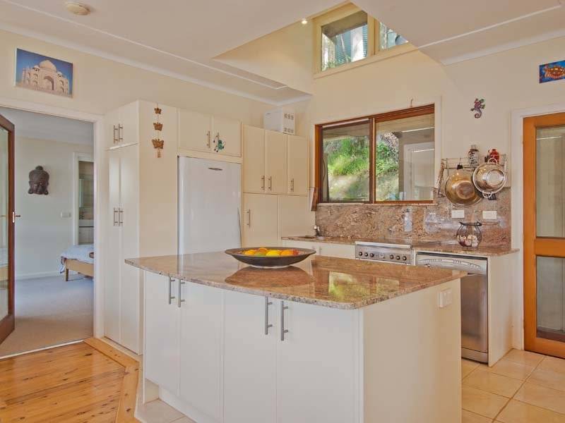Also on the air conditioned upper level, the modern kitchen with granite bench tops which includes an island breakfast bar, the combined living dining area with a slow combustion fire place and polished timber floors. Large picture windows and doors lead onto the upper balcony, an ideal place to enjoy the sunrises from.