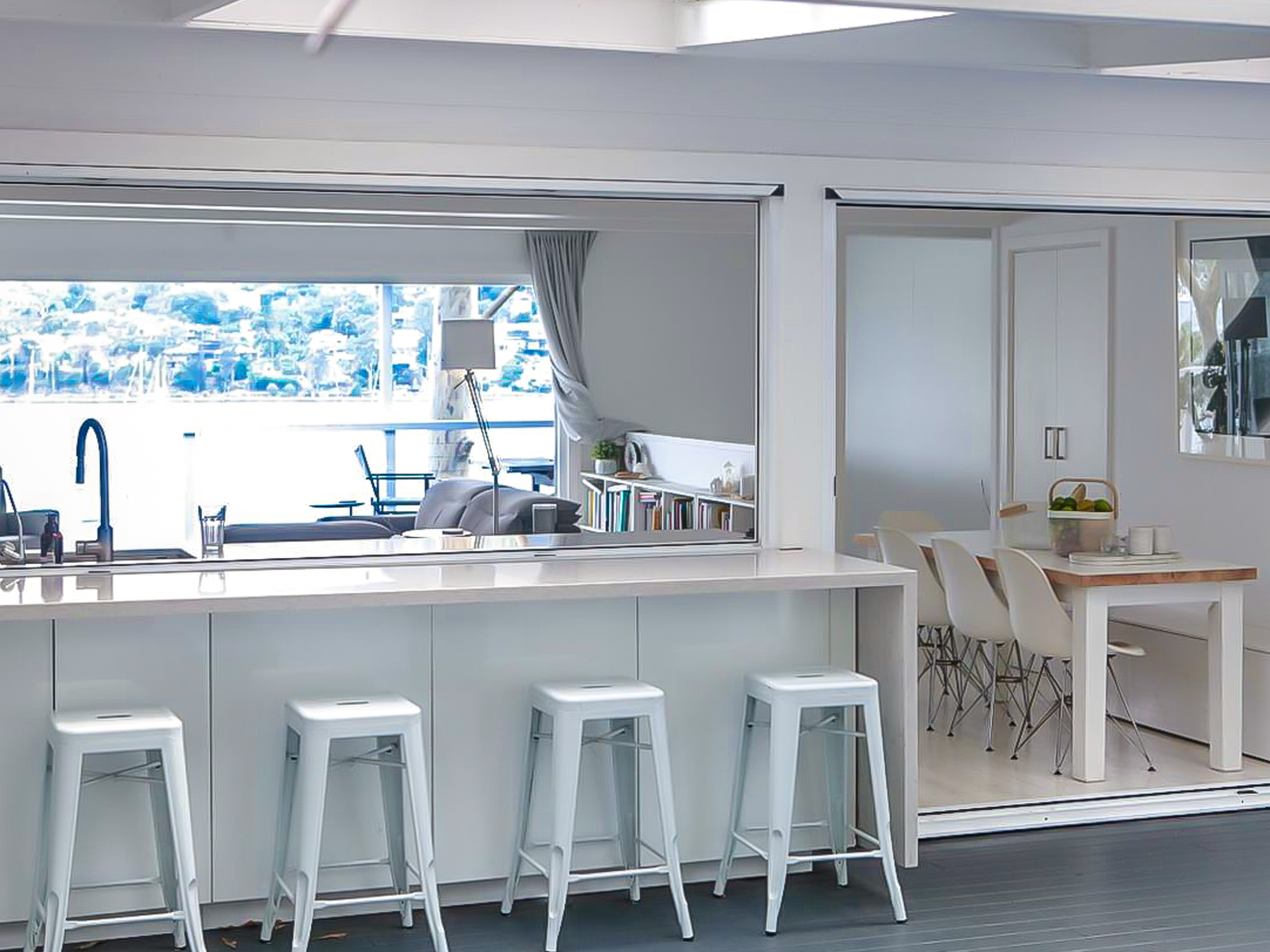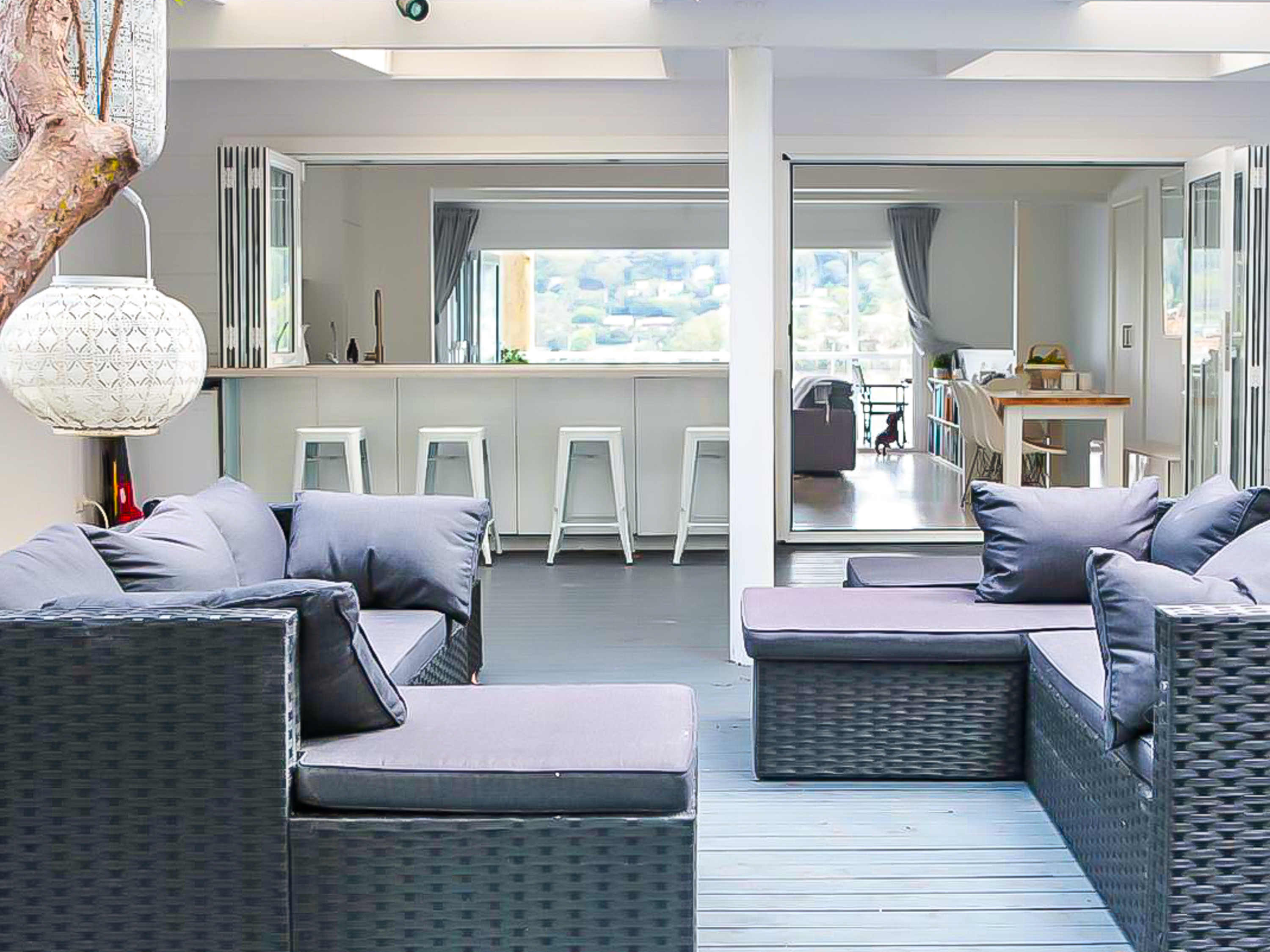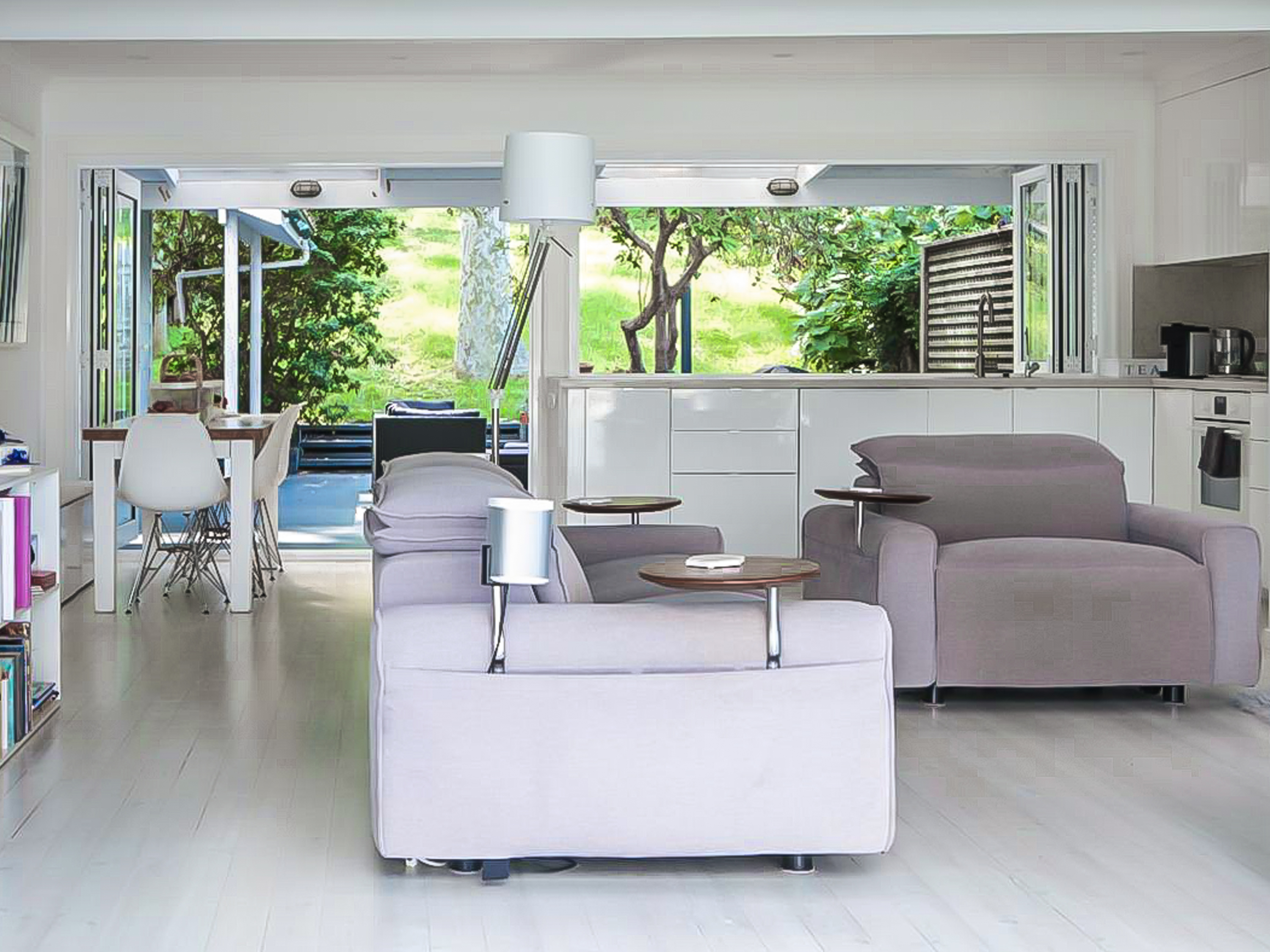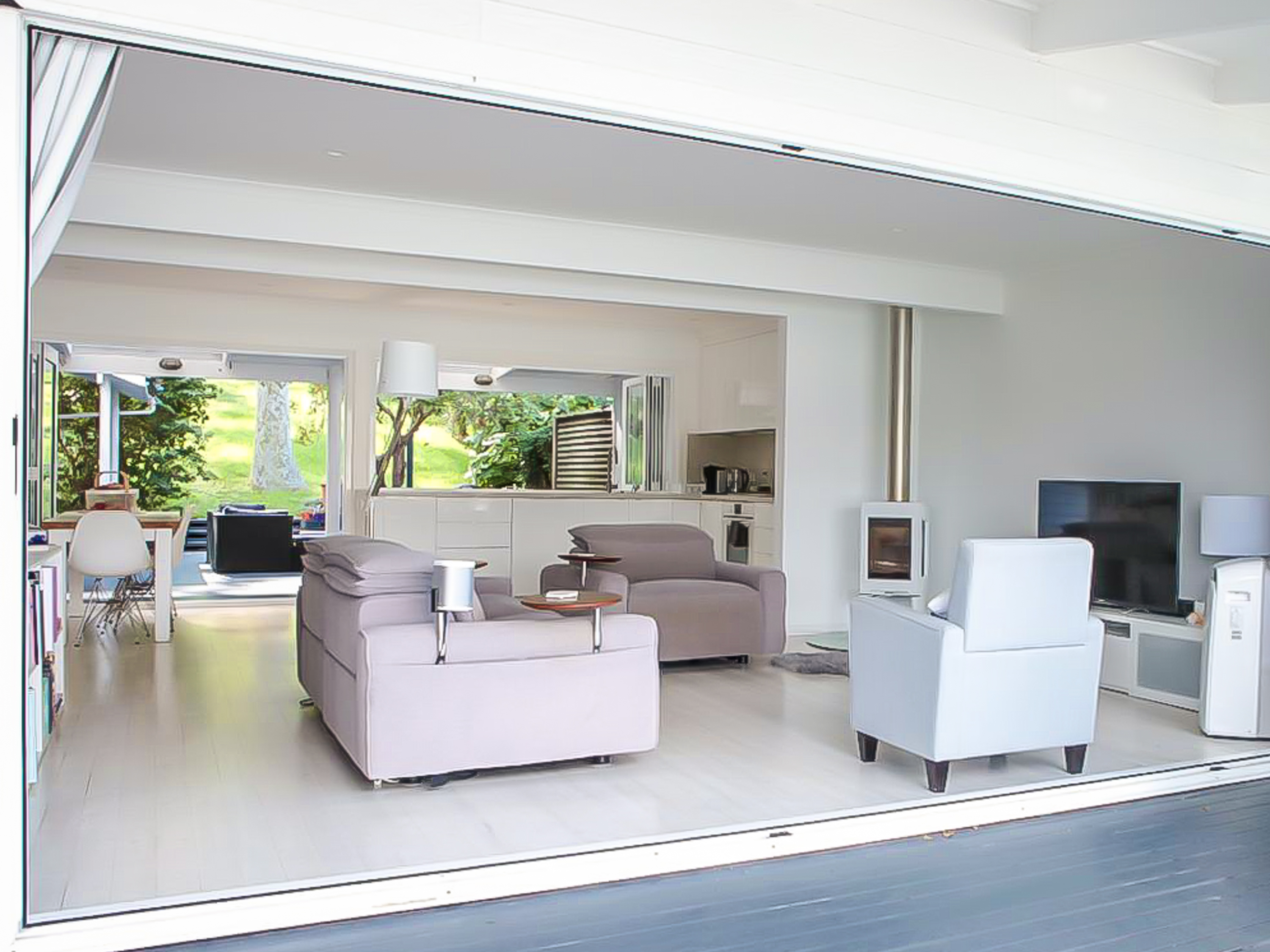 Open plan living dining with new stone top white kitchen and outdoor breakfast bar with ample storage. Main living room features latest King Furniture recliners, white slow combustion fireplace, and 5-metre bi-fold doors to open to waterfront views and large front entertaining deck.