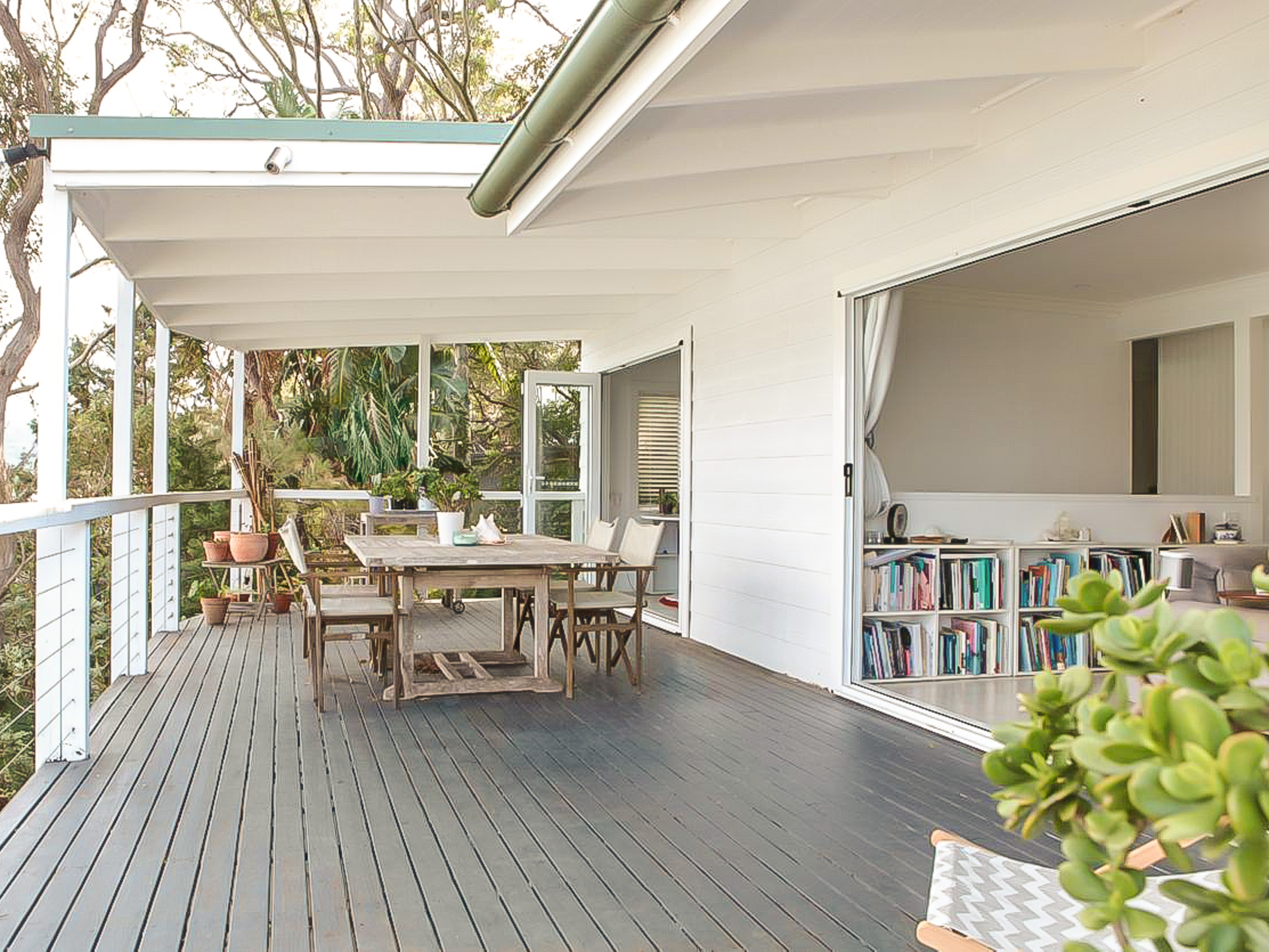 Master bedroom with walk-in wardrobe, and sliding door onto the open deck with water views. Bedroom 2 is double sized with built-ins and water views. Bedroom 3 with bi-fold door onto the main entertaining deck (currently pictured as an office), Bedroom 4 is self-contained and can be used as an office or studio and opens onto the rear deck.