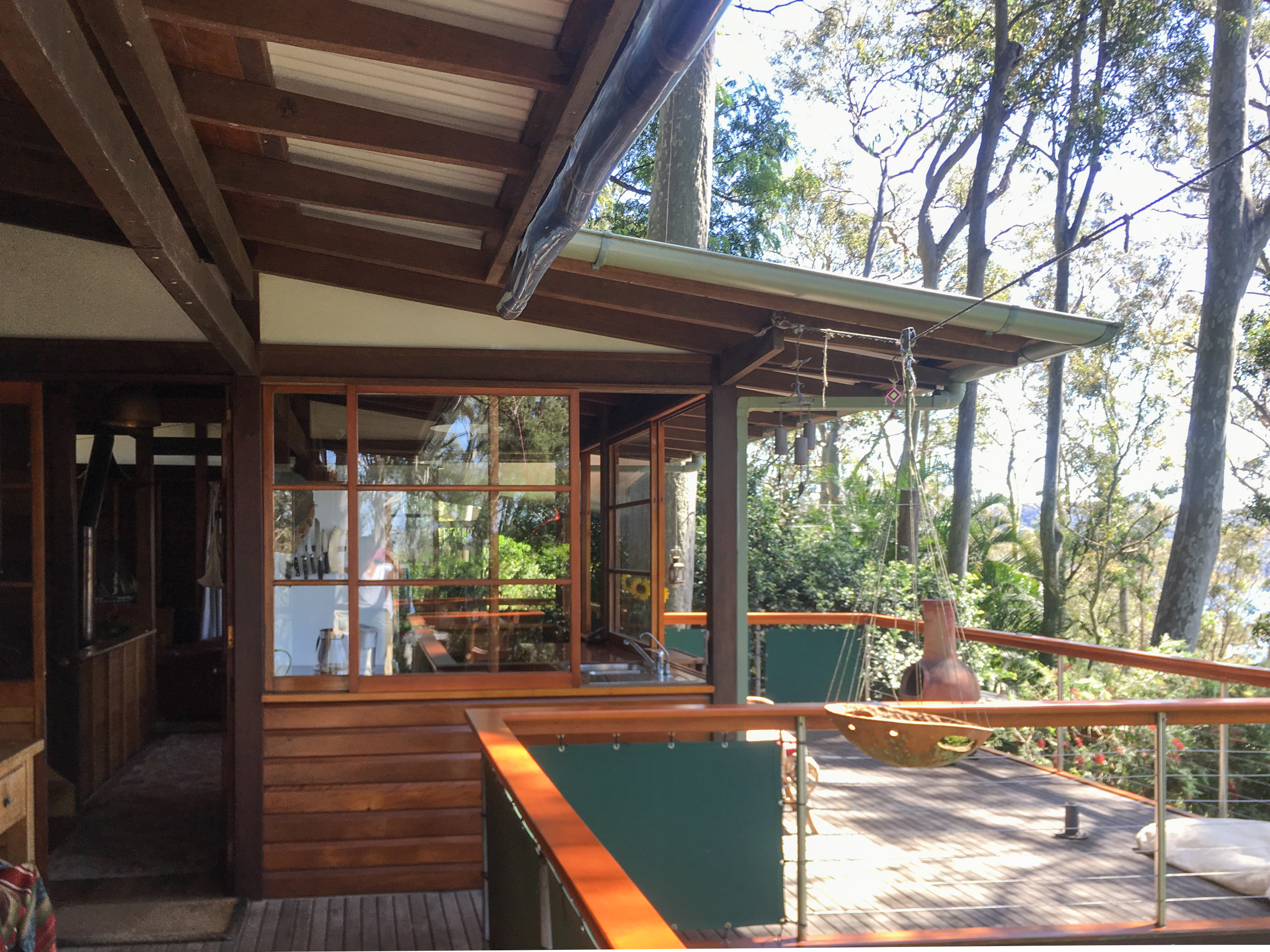 Exposed timber frame work with silver ash wall framing complete with a craftsman built Qld Kauri and brushbox kitchen. Split level design comprising of three bedrooms and two bathrooms, separate studio/office and a private seperate quest room.