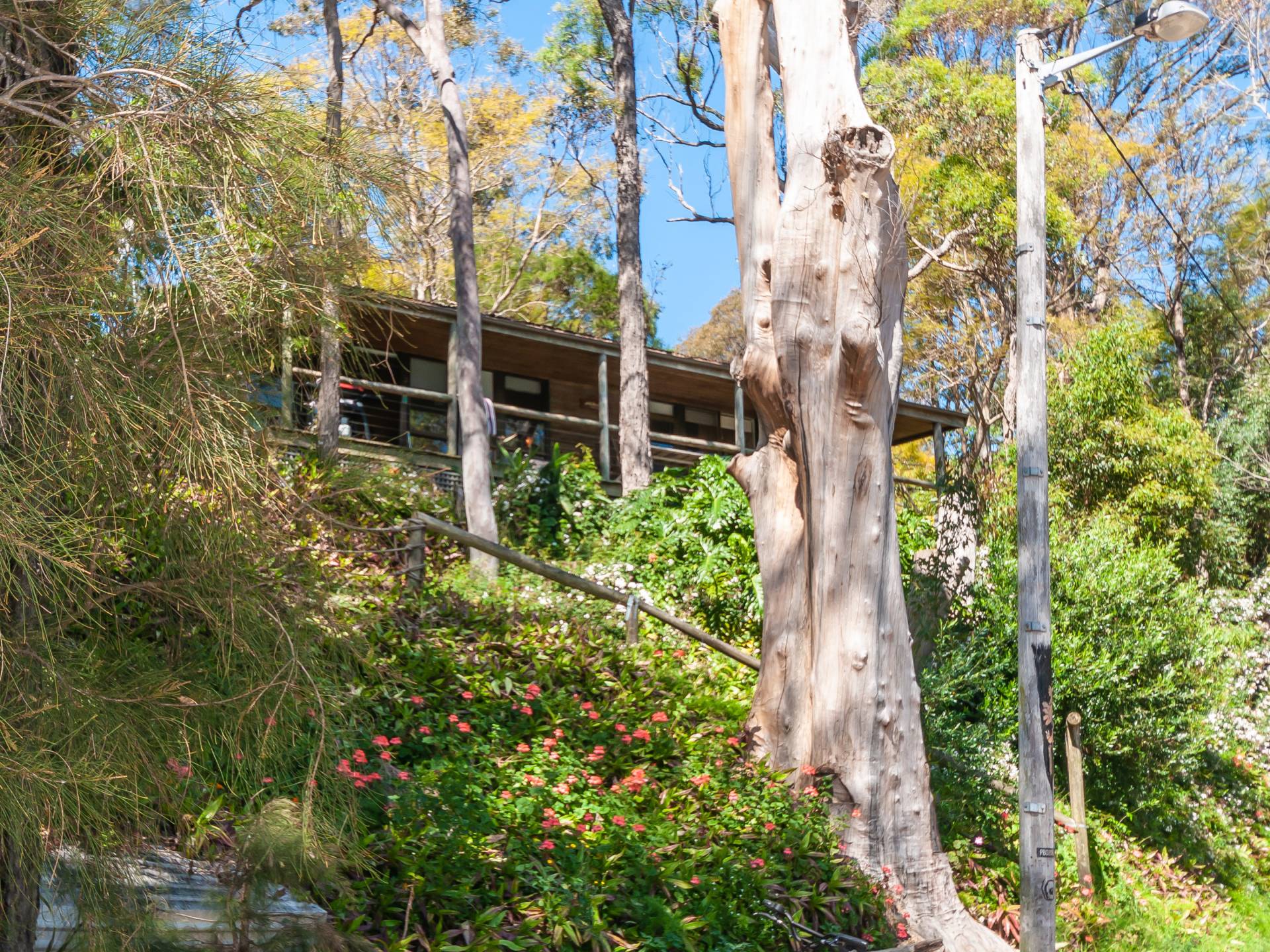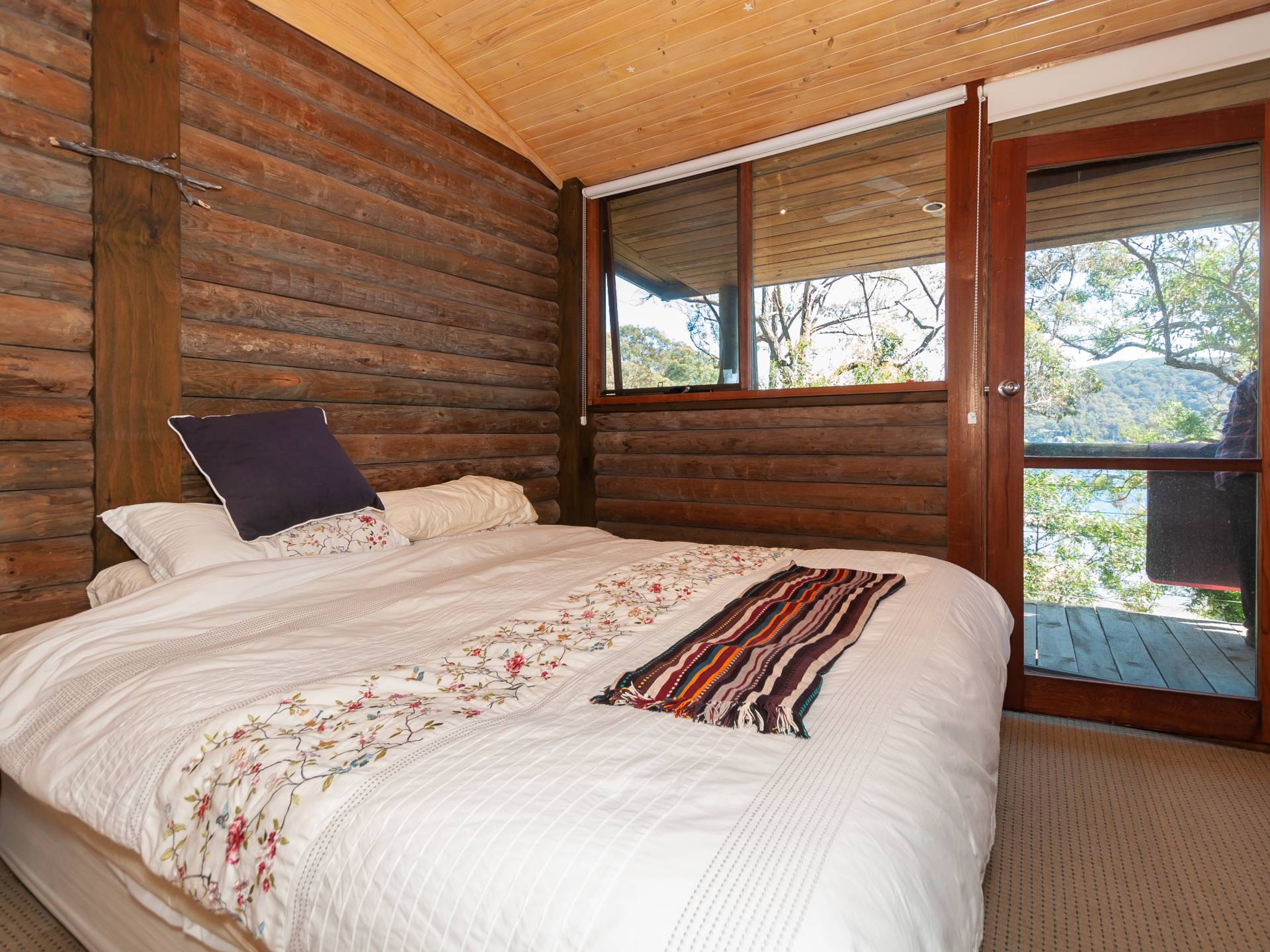This perfectly positioned north facing log cabin enjoys stunning Pittwater views to the Ku-ring-gai National Park, sunlight all year round and stunning sunsets.