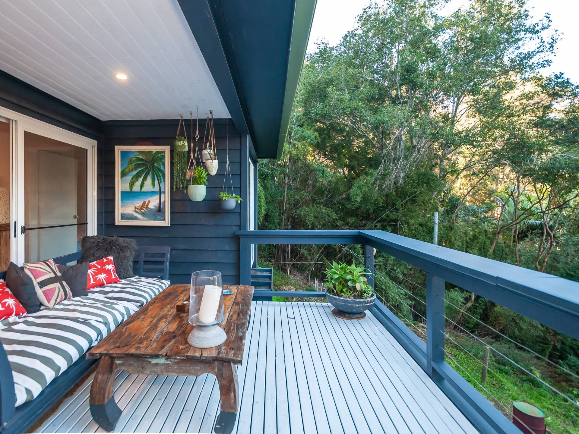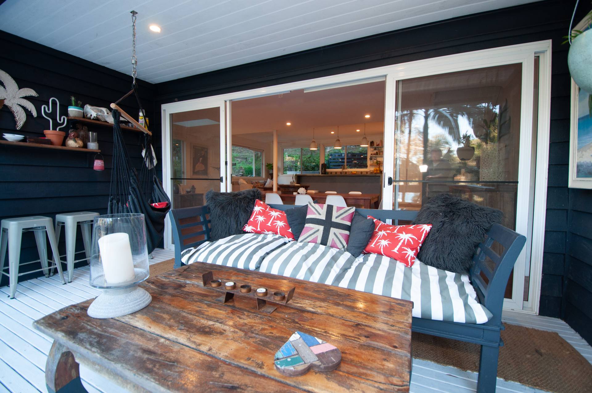 The entertaining deck with water views leads off from the lounge via double sliding doors.