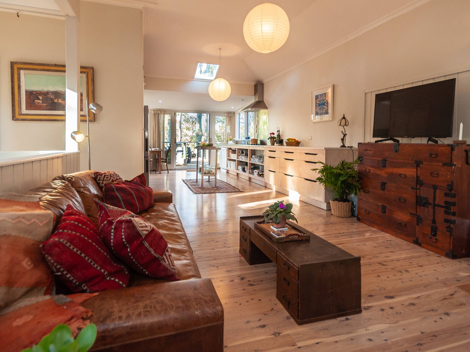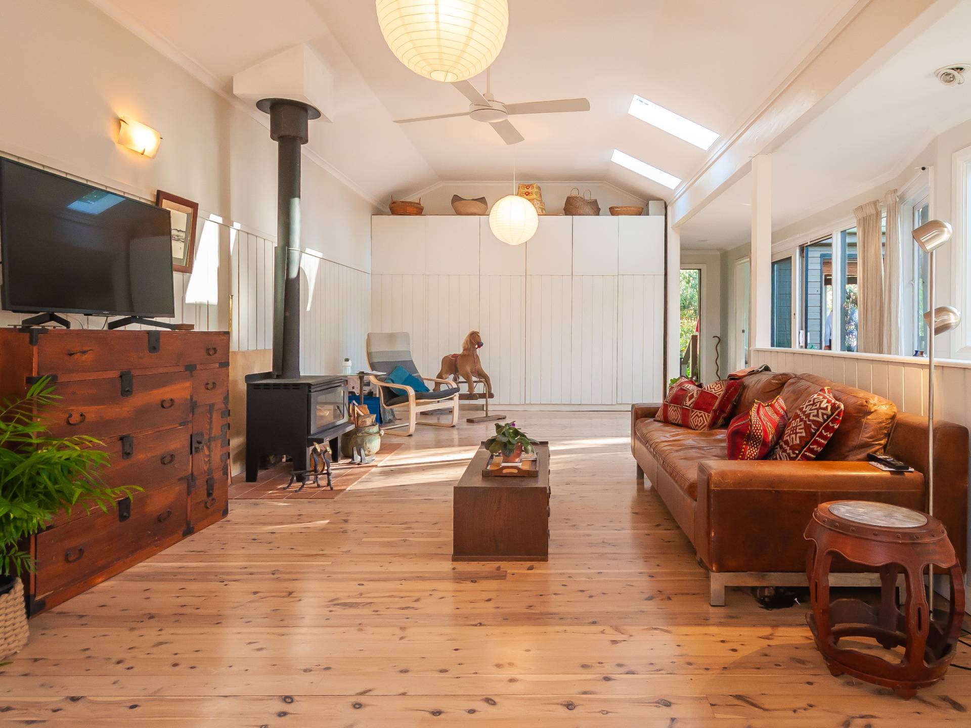 The upper level embraces natural light through windows and several skylights and features timber floors throughout along with a combustion fire place.