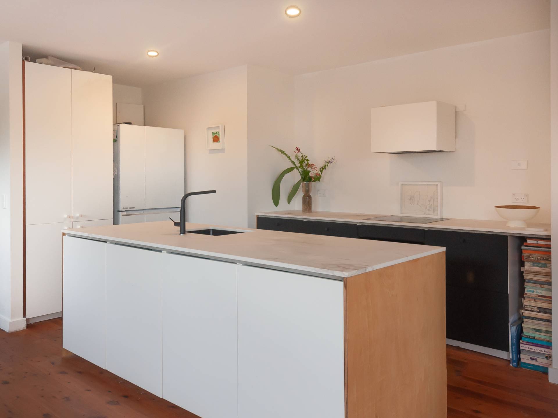 The main living area is open plan with a new kitchen complete with a large island bench, marble bench tops and Miele appliances.