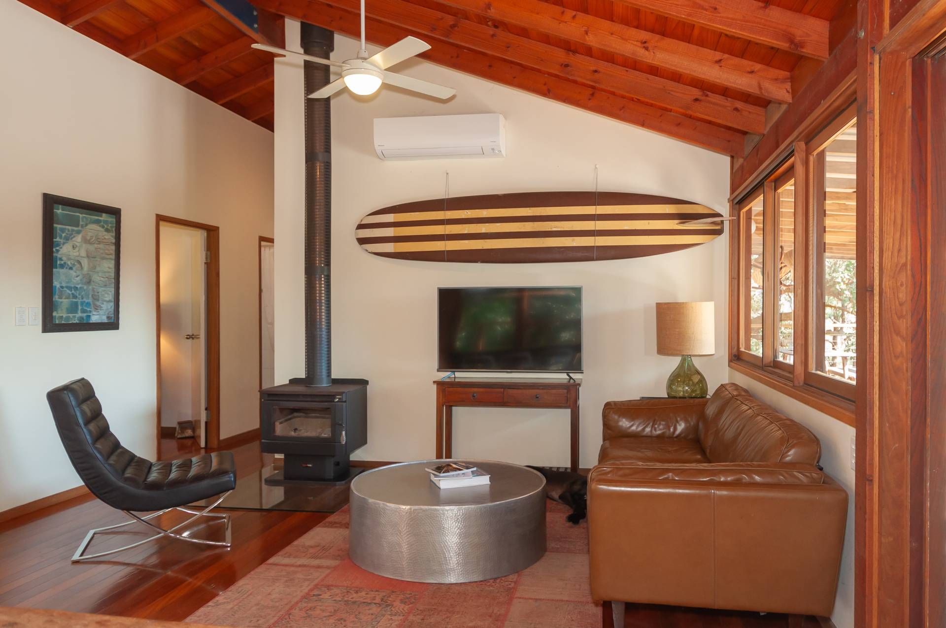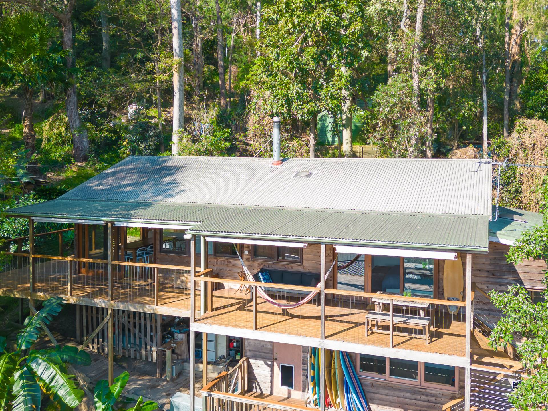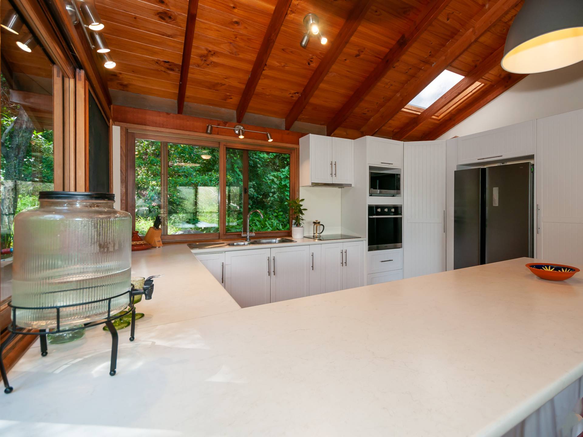 Built over three split levels this home is light and airy and features timber beams, doors, windows and floors.  Sky lights and ceiling fans are featured throughout the home.