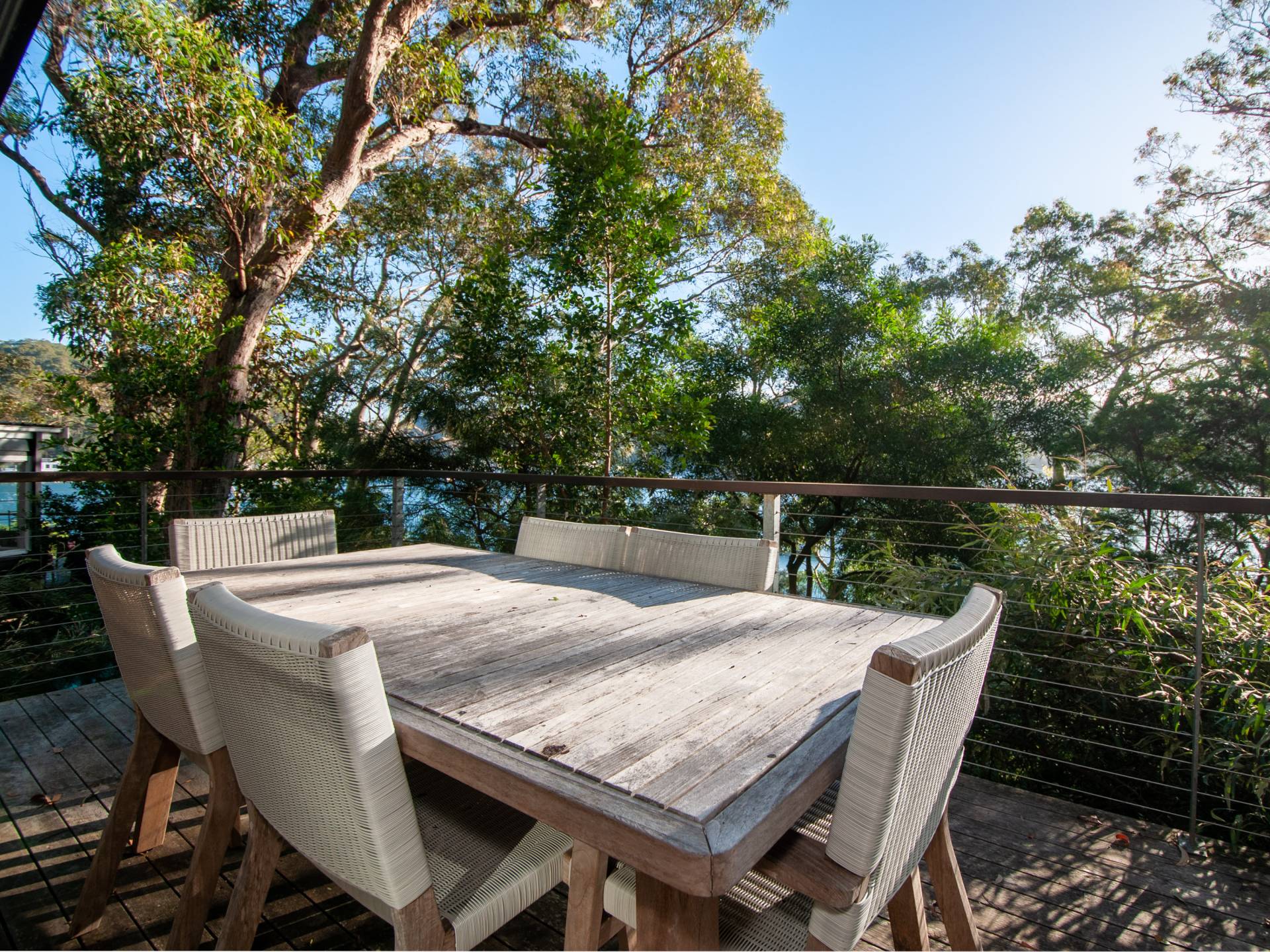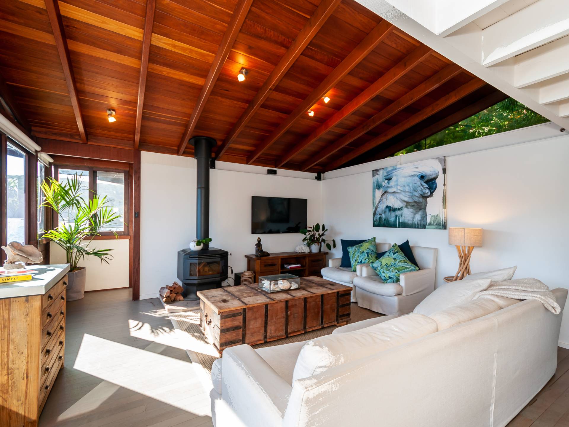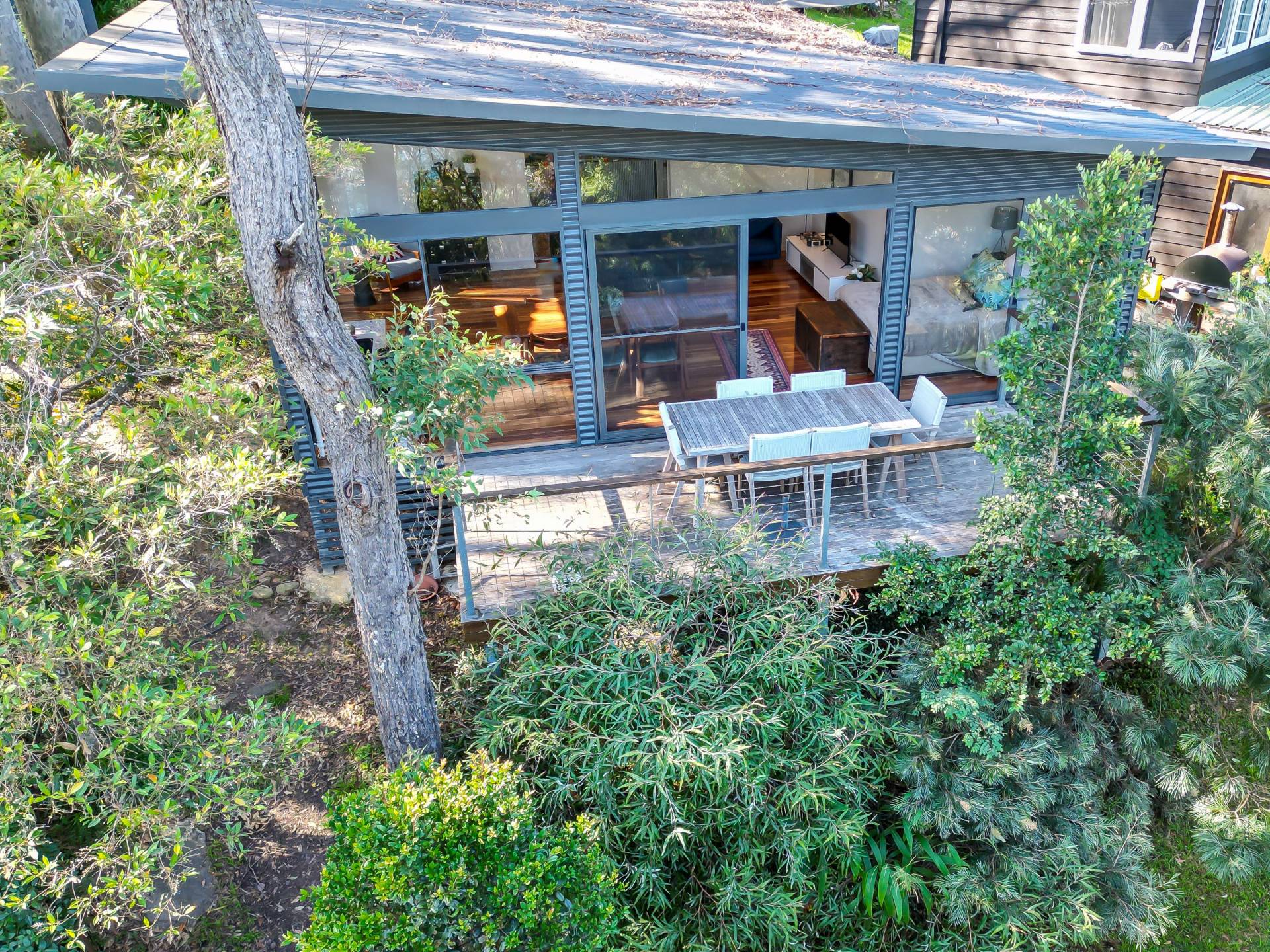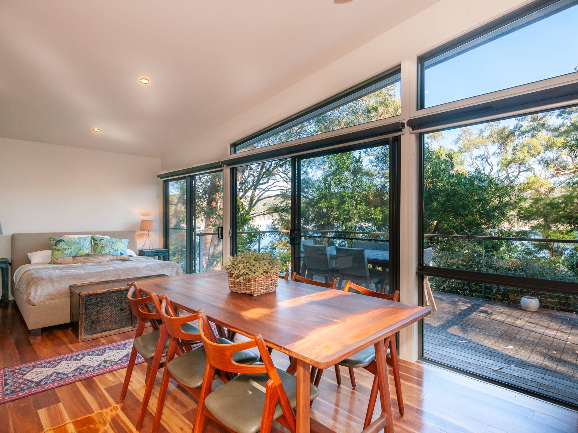 A separate and spacious studio is fully self contained and includes a full bathroom, kitchenette, storage or bunk room and a deck which has views through the spotted gums to the water.