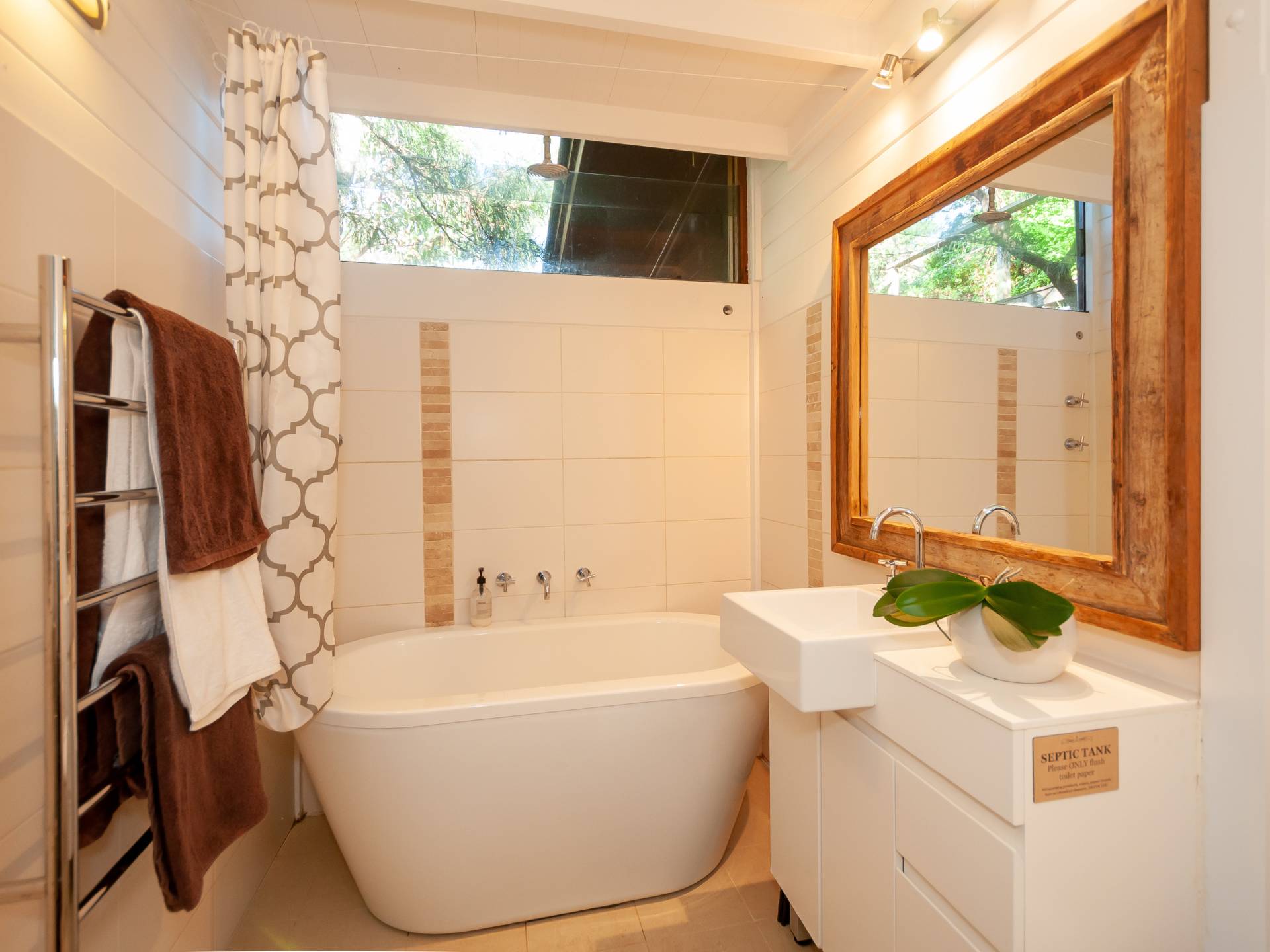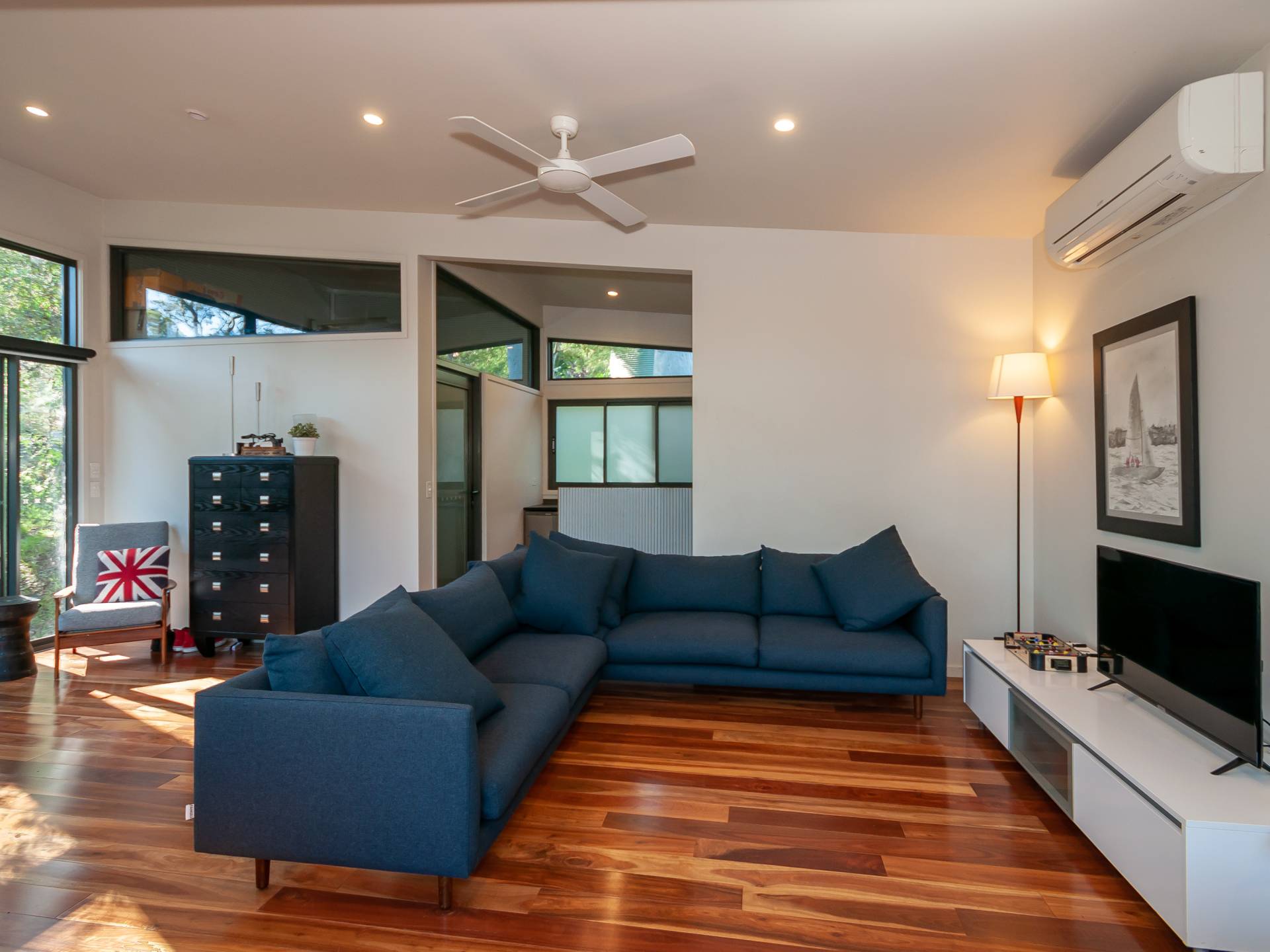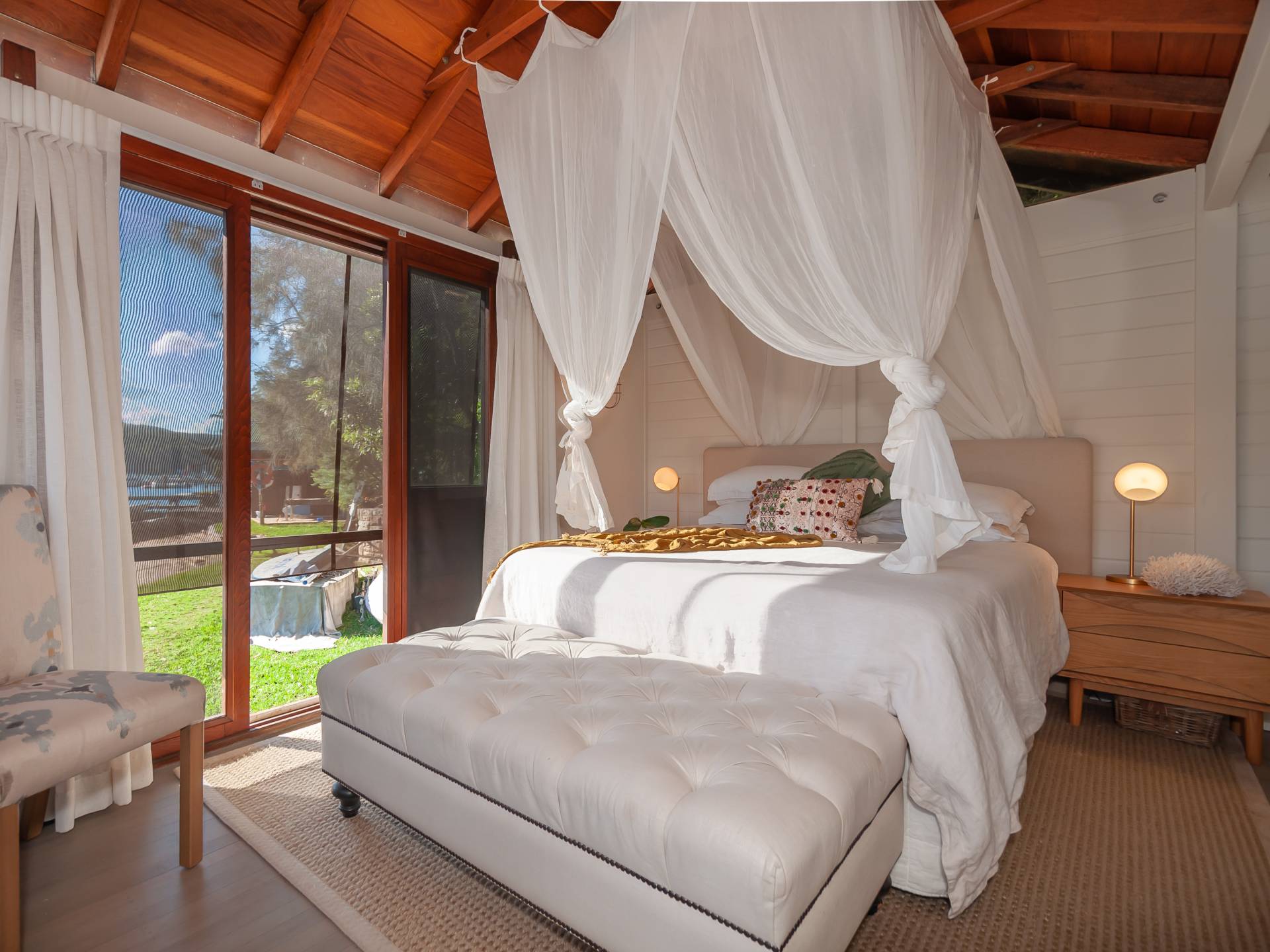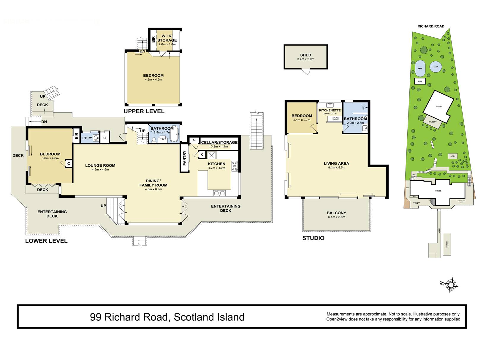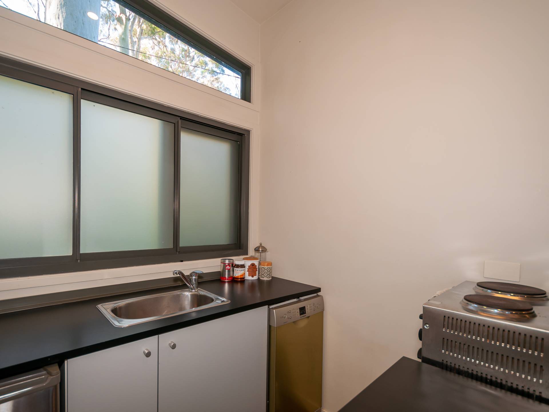 A separate and spacious studio is fully self contained and includes a full bathroom, kitchenette, storage or bunk room and a deck which has views through the spotted gums to the water.