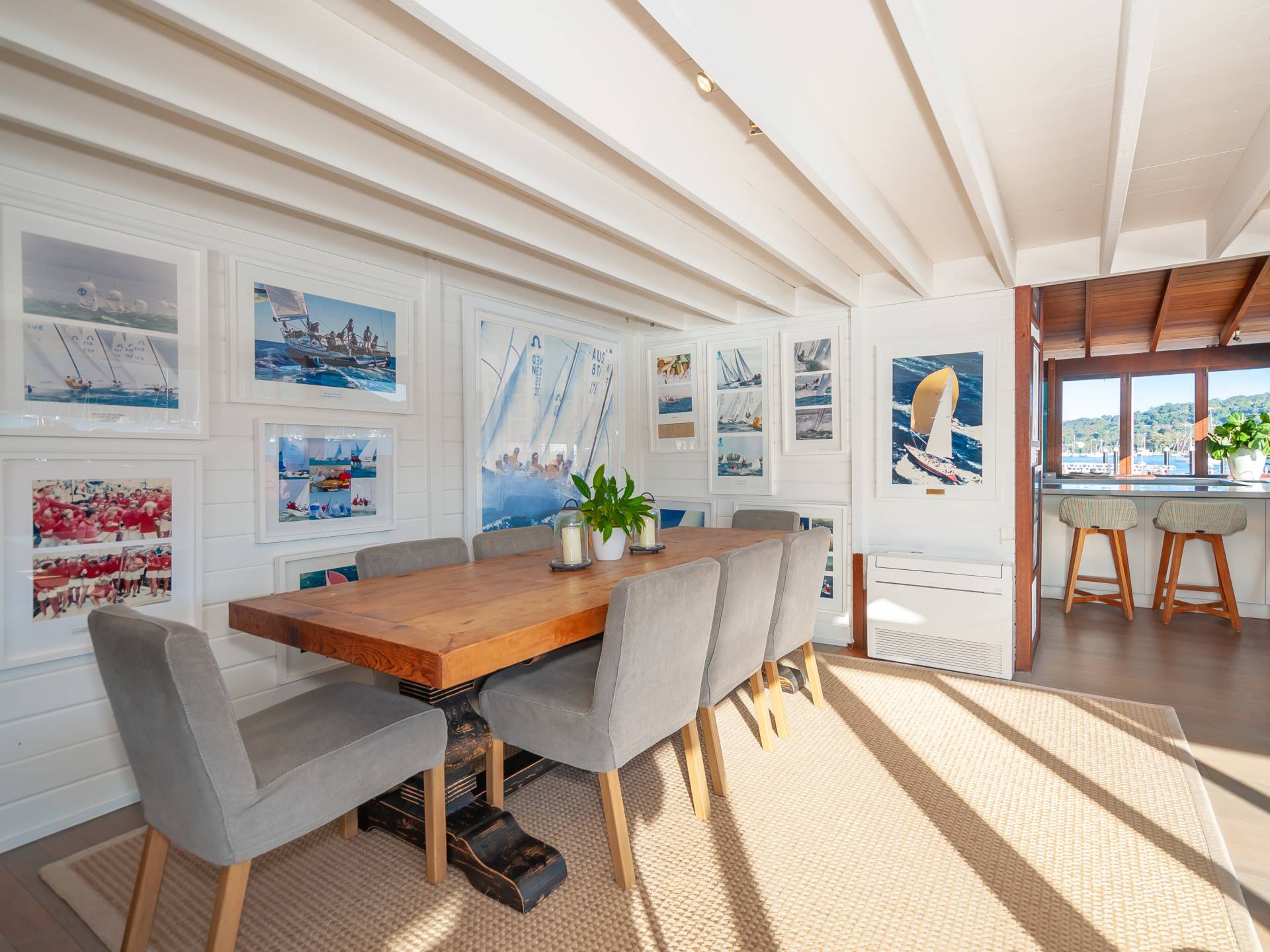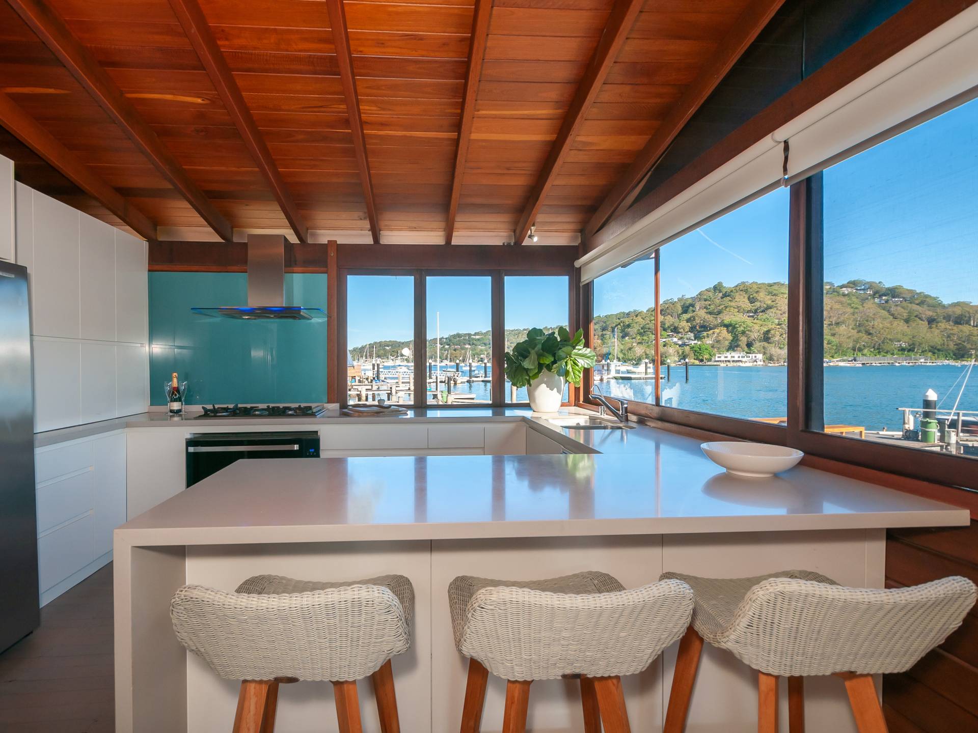 The open plan lounge/dining room has high timber cathedral ceilings and a central picture window which is perfect to watch the yachts sail past from. The stylish kitchen has a double width oven, dishwasher, breakfast bar, pantry and is complete with a wine cellar.