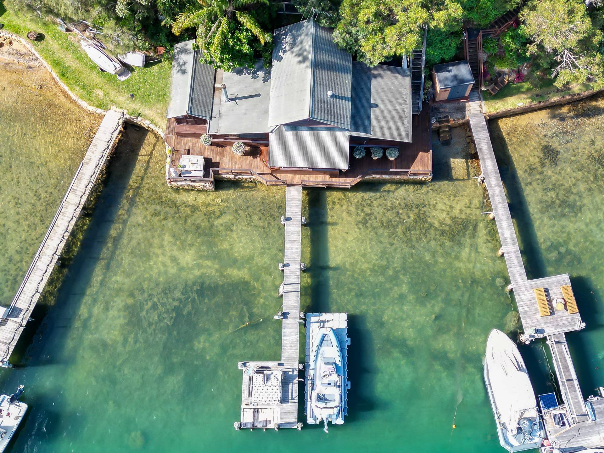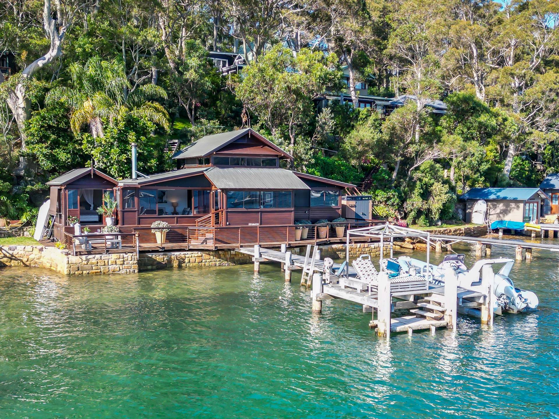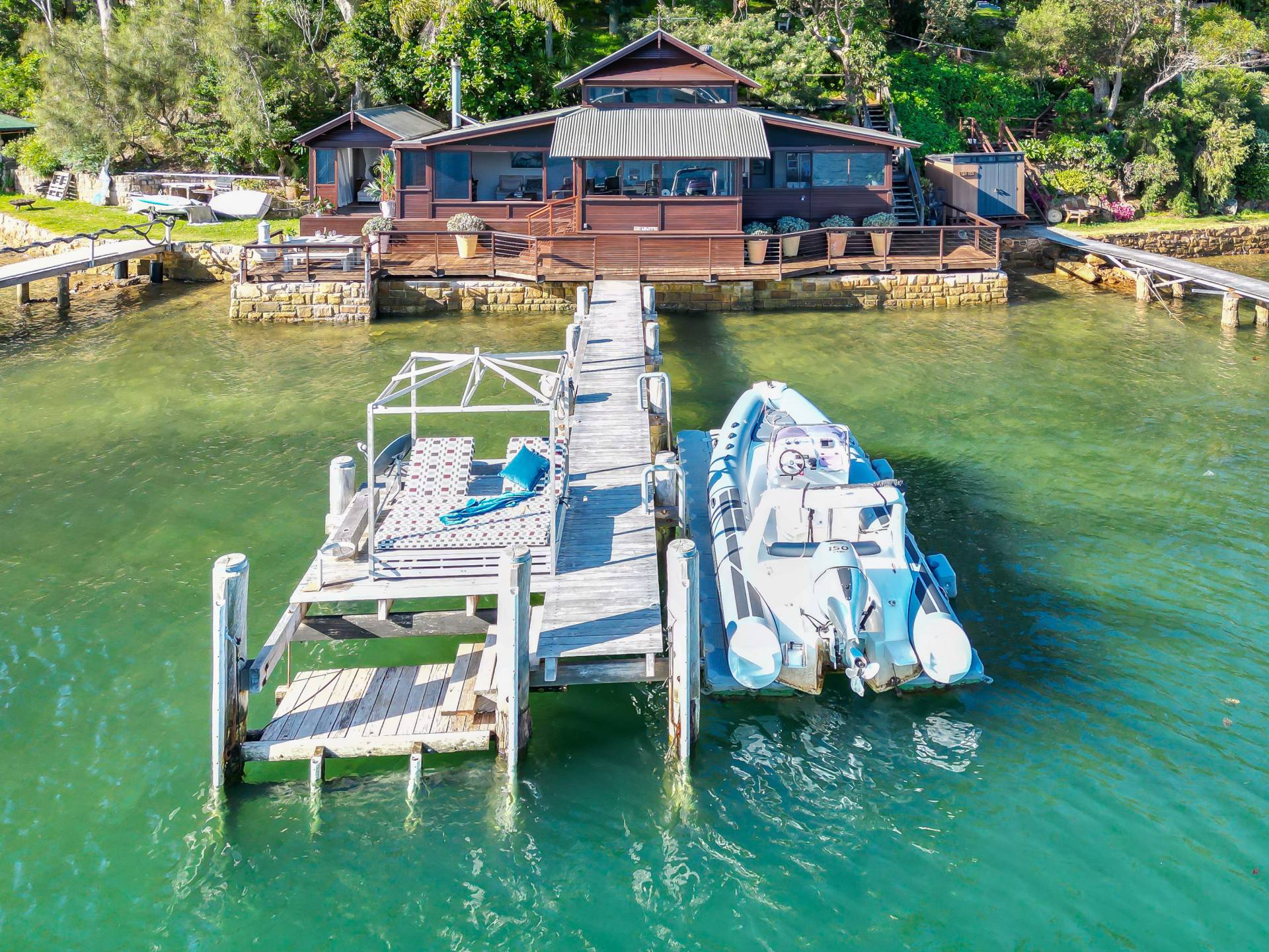 The waterfront facilities include a deep water jetty capable of mooring a large boat, a sunbaking/reading landing and a floating pontoon.