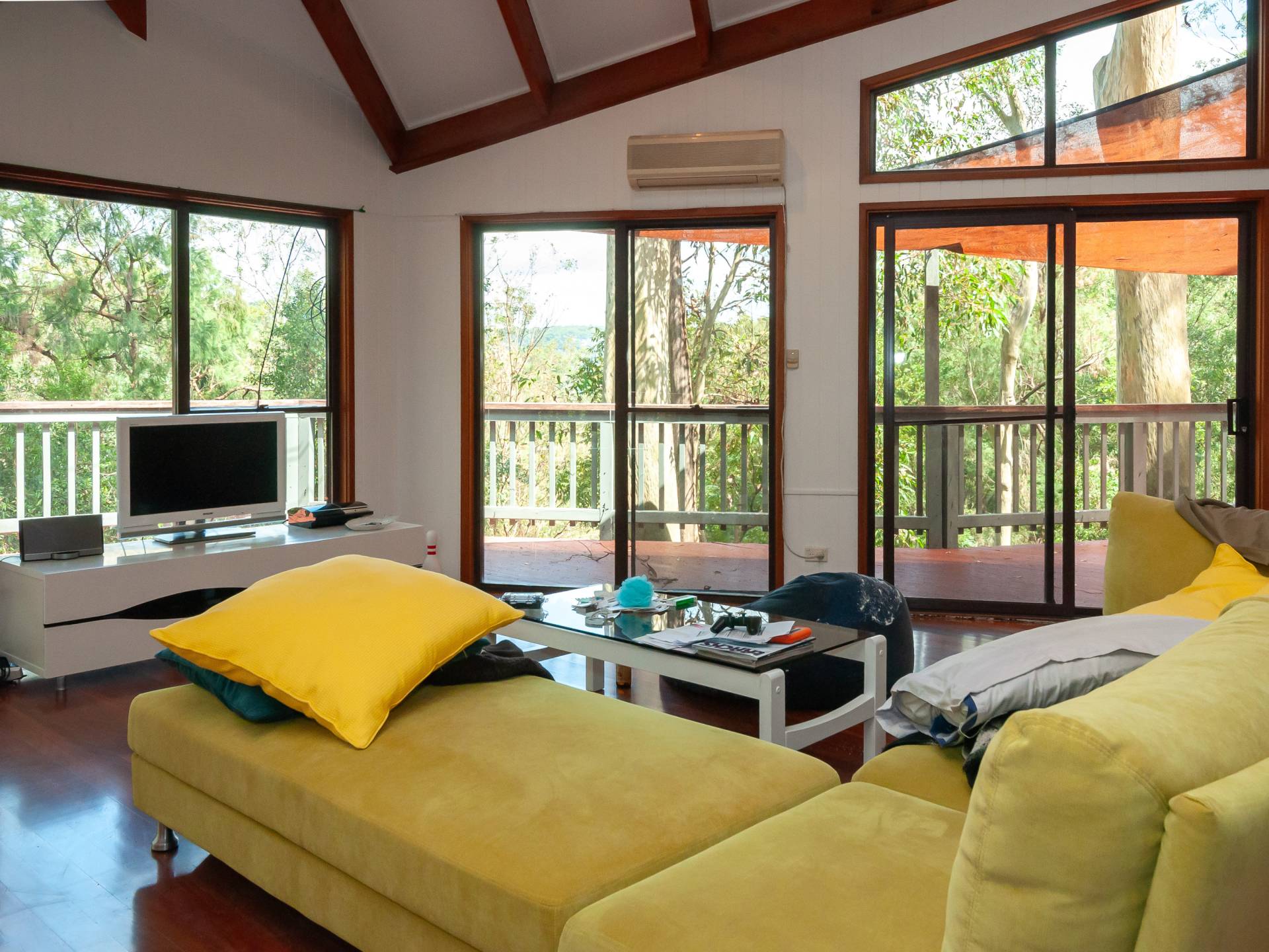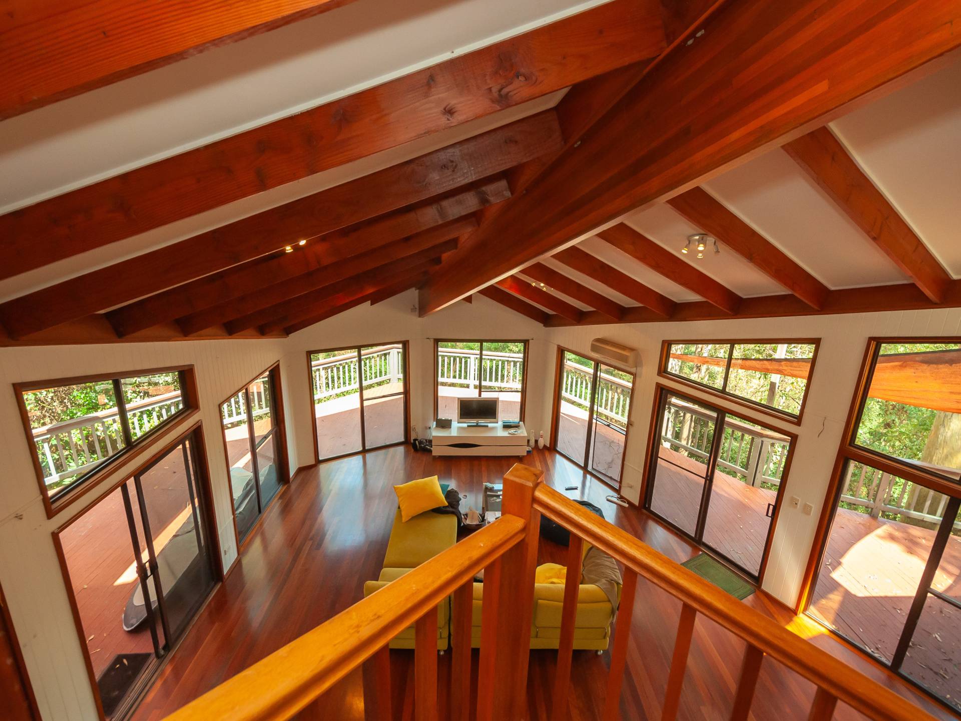 Large open plan lounge, dining room and kitchen with wide windows and a large entertaining deck.