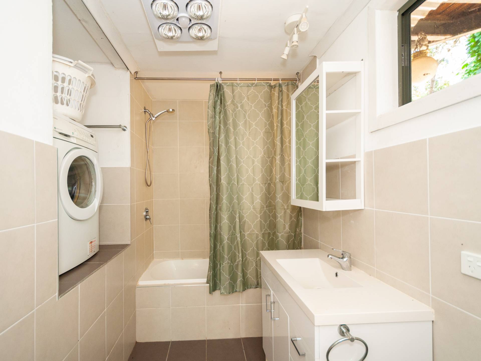 The bathroom has a bath with an overhead shower and is combined with the laundry which includes a washing machine.