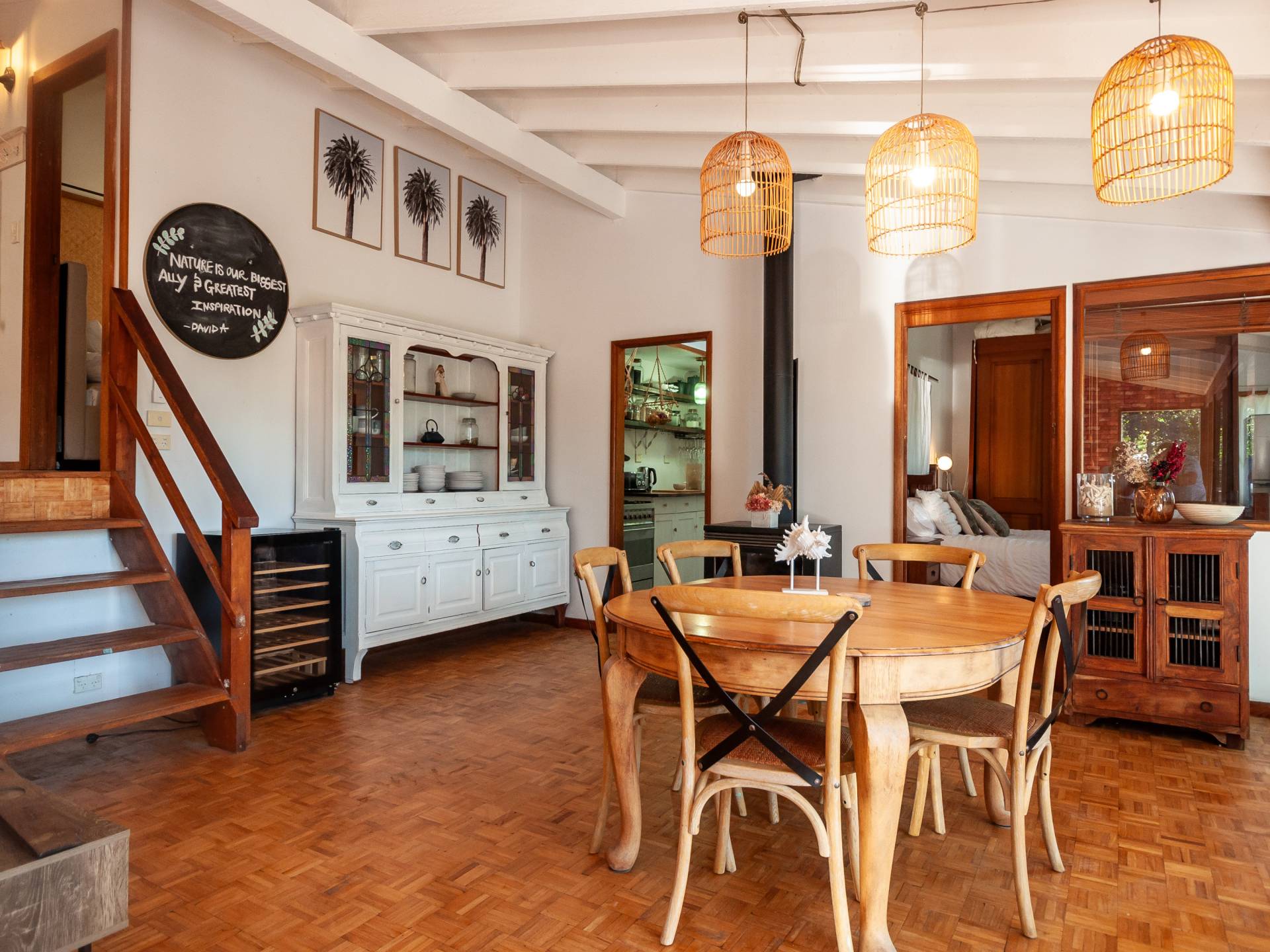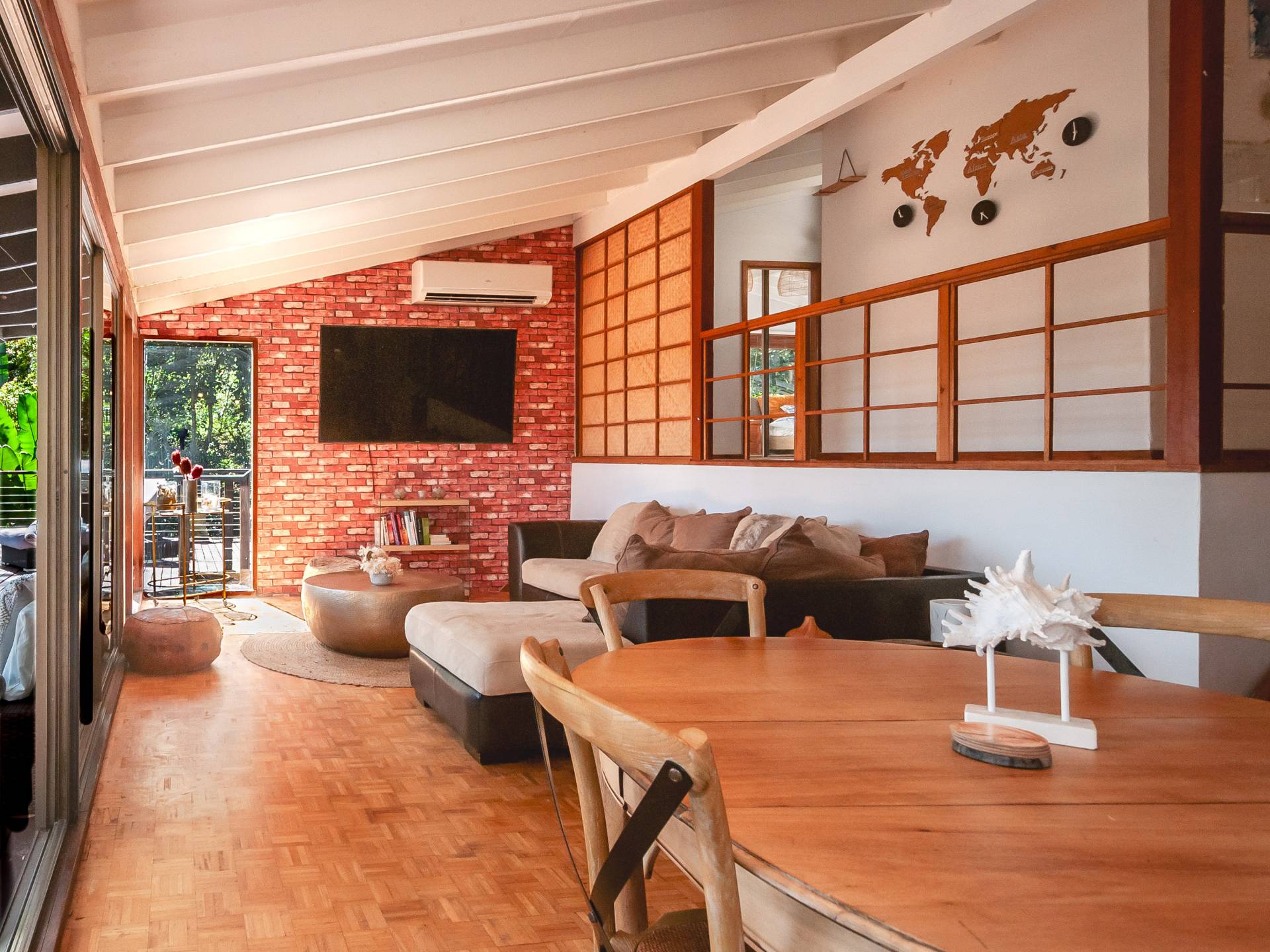 An open plan lounge/dining incudes floor to ceiling sliding doors and windows allowing for the natural light to flow in,  parquetry flooring, a combustion fire and air conditioning ensuring all year round comfort.