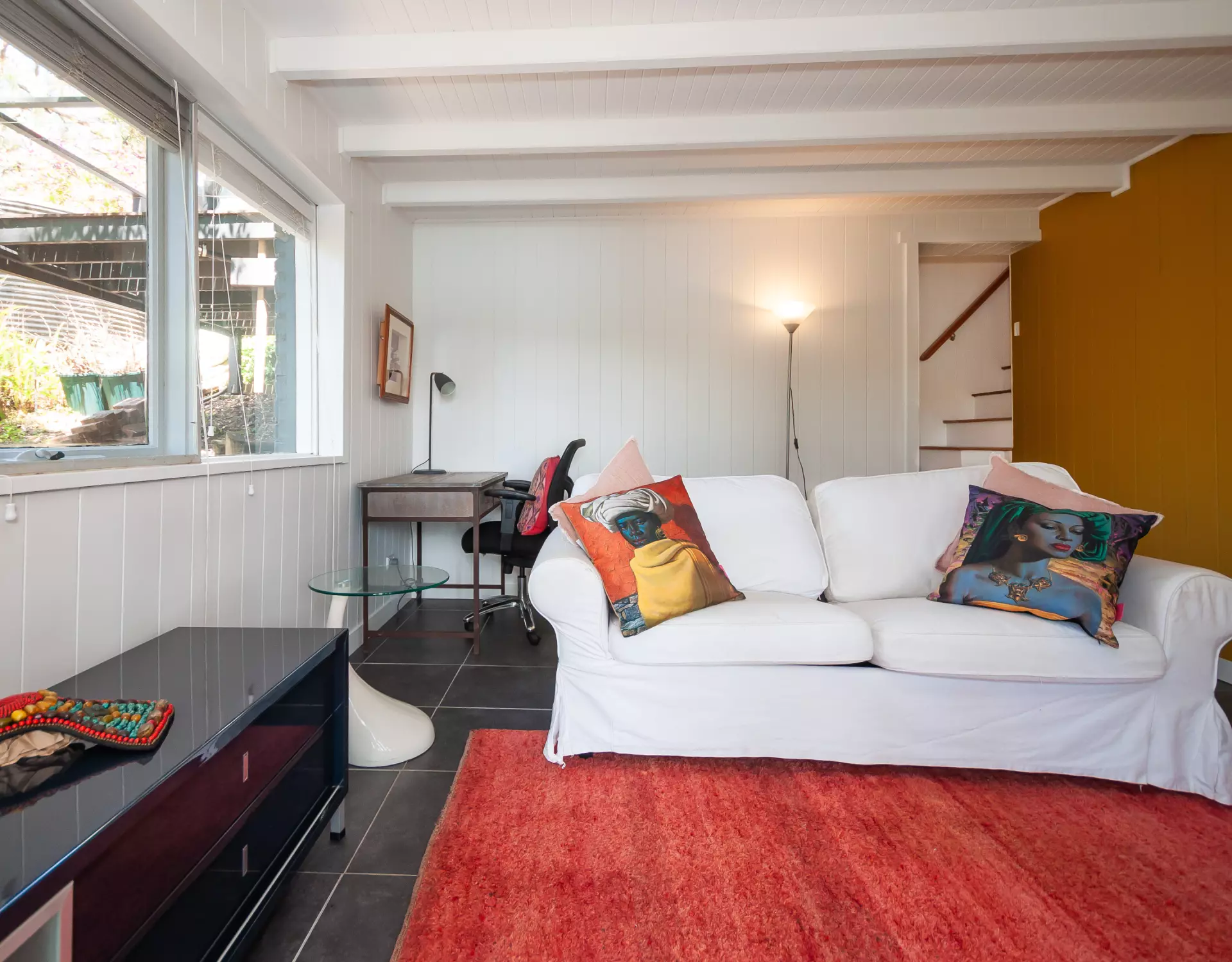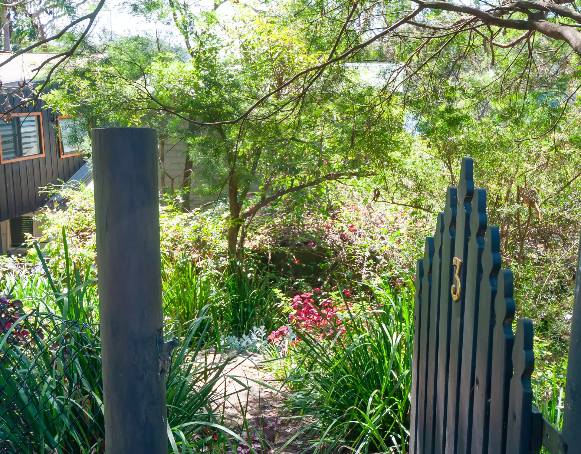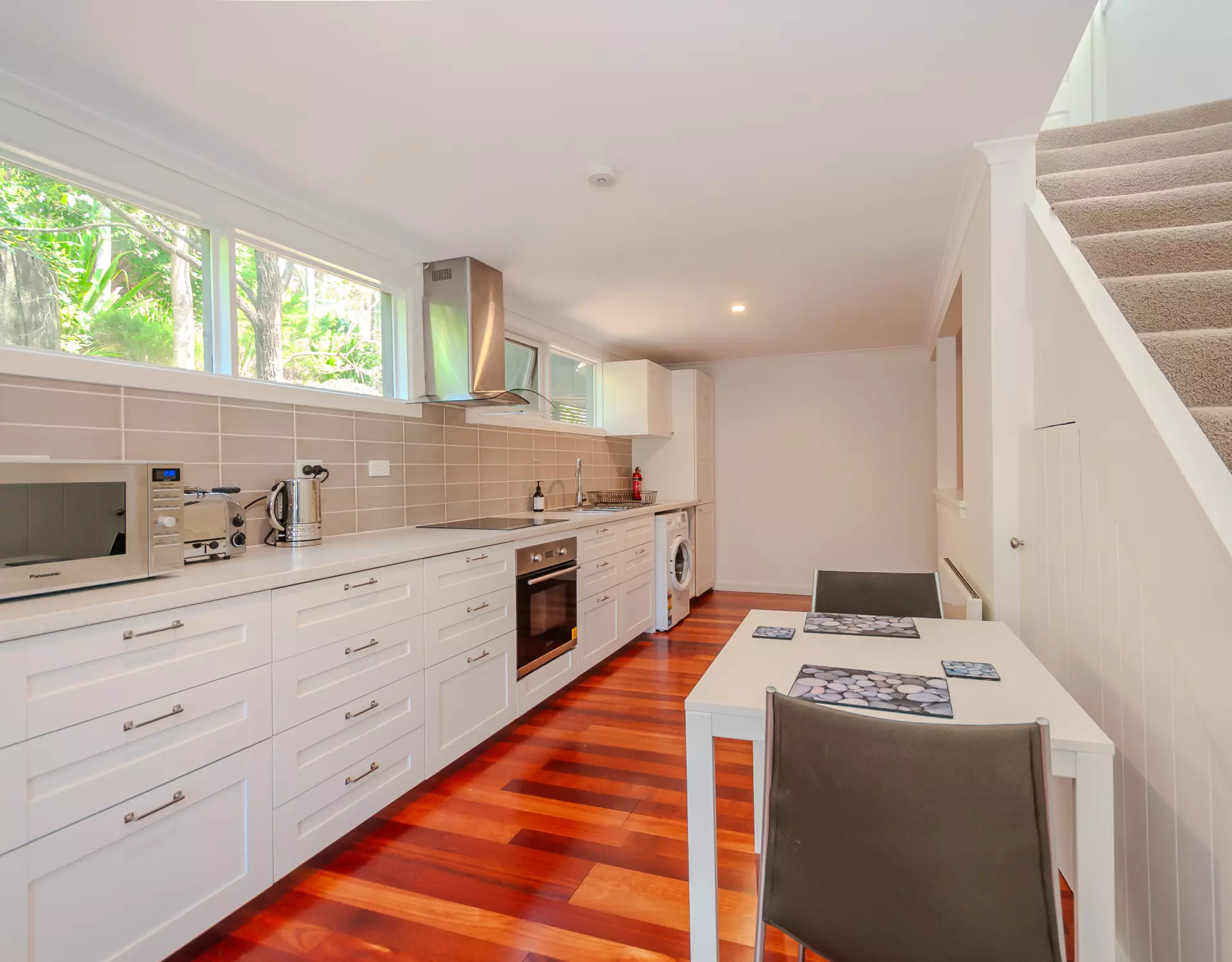 Having its own entrance, wander through gardens to a deck area into a full kitchen which includes a washing machine.