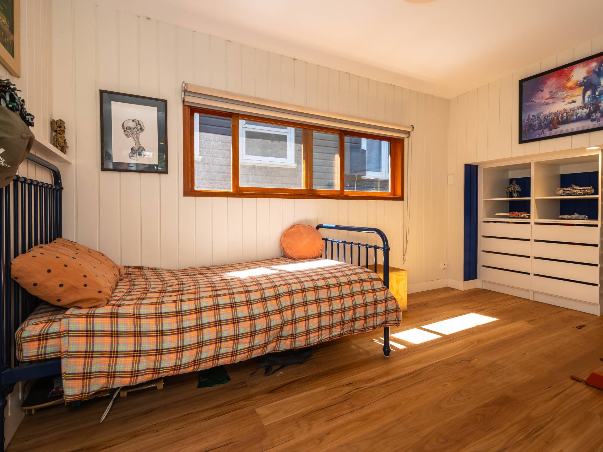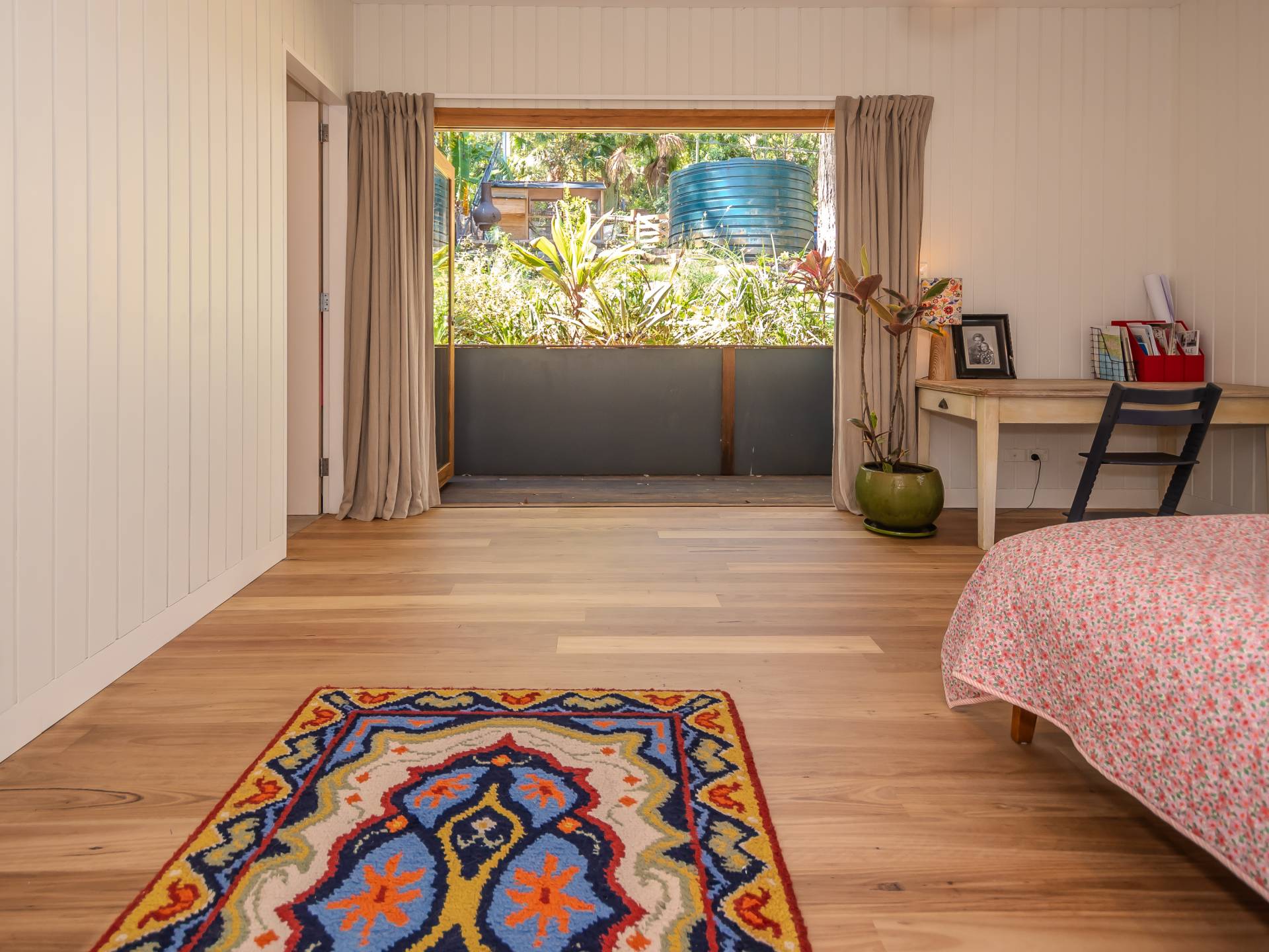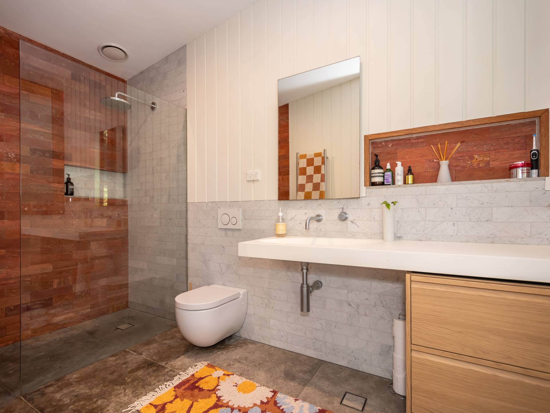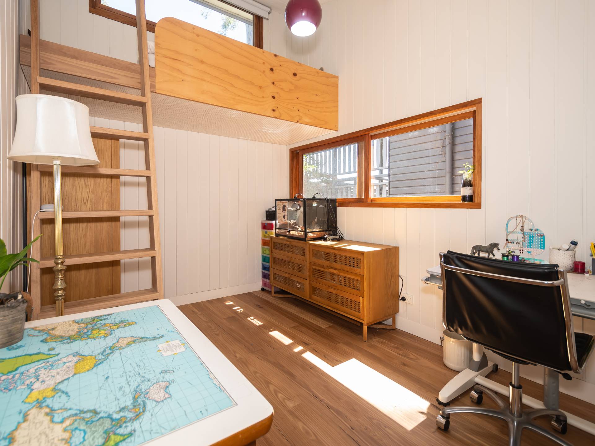 Accommodation comprises three bedrooms, including a unique loft-style double bed space in one bedroom, while the expansive master suite is privately positioned on its own level, complete with a spacious ensuite and walk-in robe. Large timber sliding doors open from the master to a private courtyard creating a peaceful retreat.