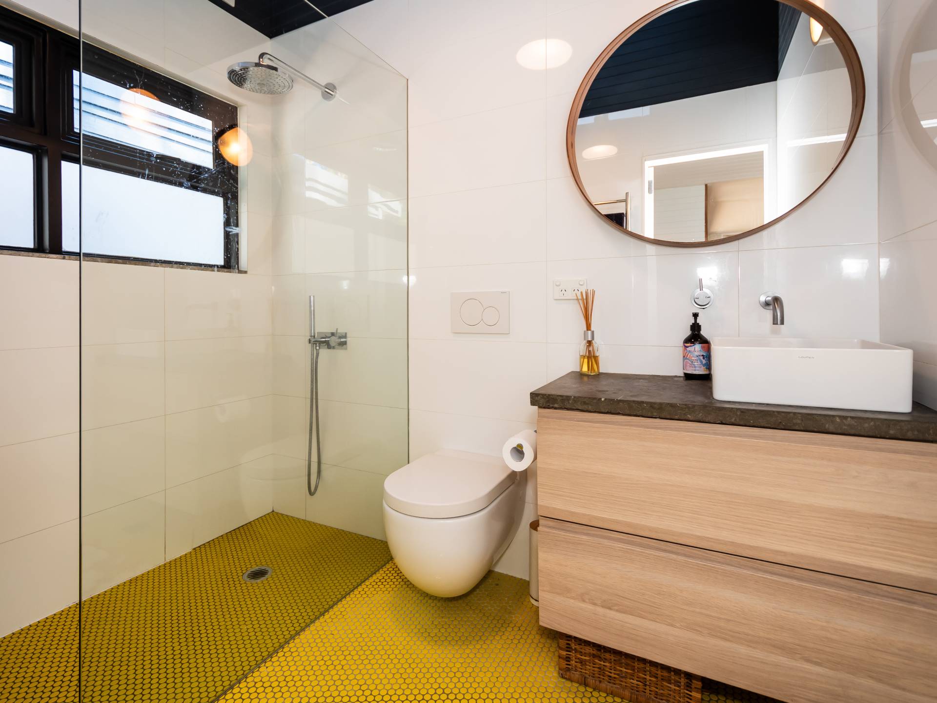The split level open plan living and dining areas feature high ceilings with skylights and polished concrete floors with underfloor heating throughout.
